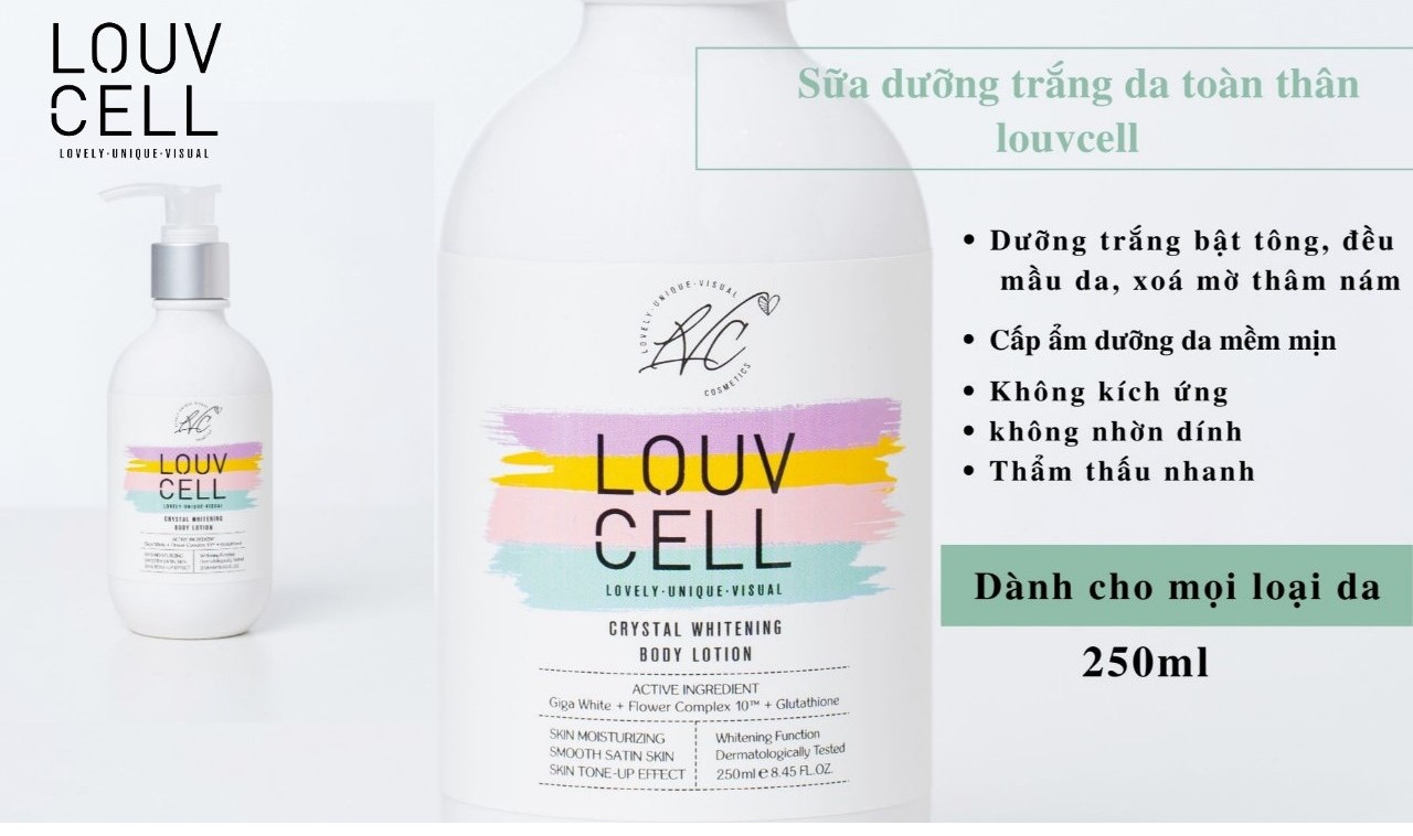 - Sữa Dưỡng Thể Trắng Da, Nâng Tone LouvCell Crystal Whitening Body Lotion có hiệu quả cấp ẩm tuyệt đối cho da, bổ sung dưỡng chất cần thiết để thúc đẩy quá trình sản xuất tế bào mới thay thế tế bào đã chết. Trong đó có 3 thành phần chính là: