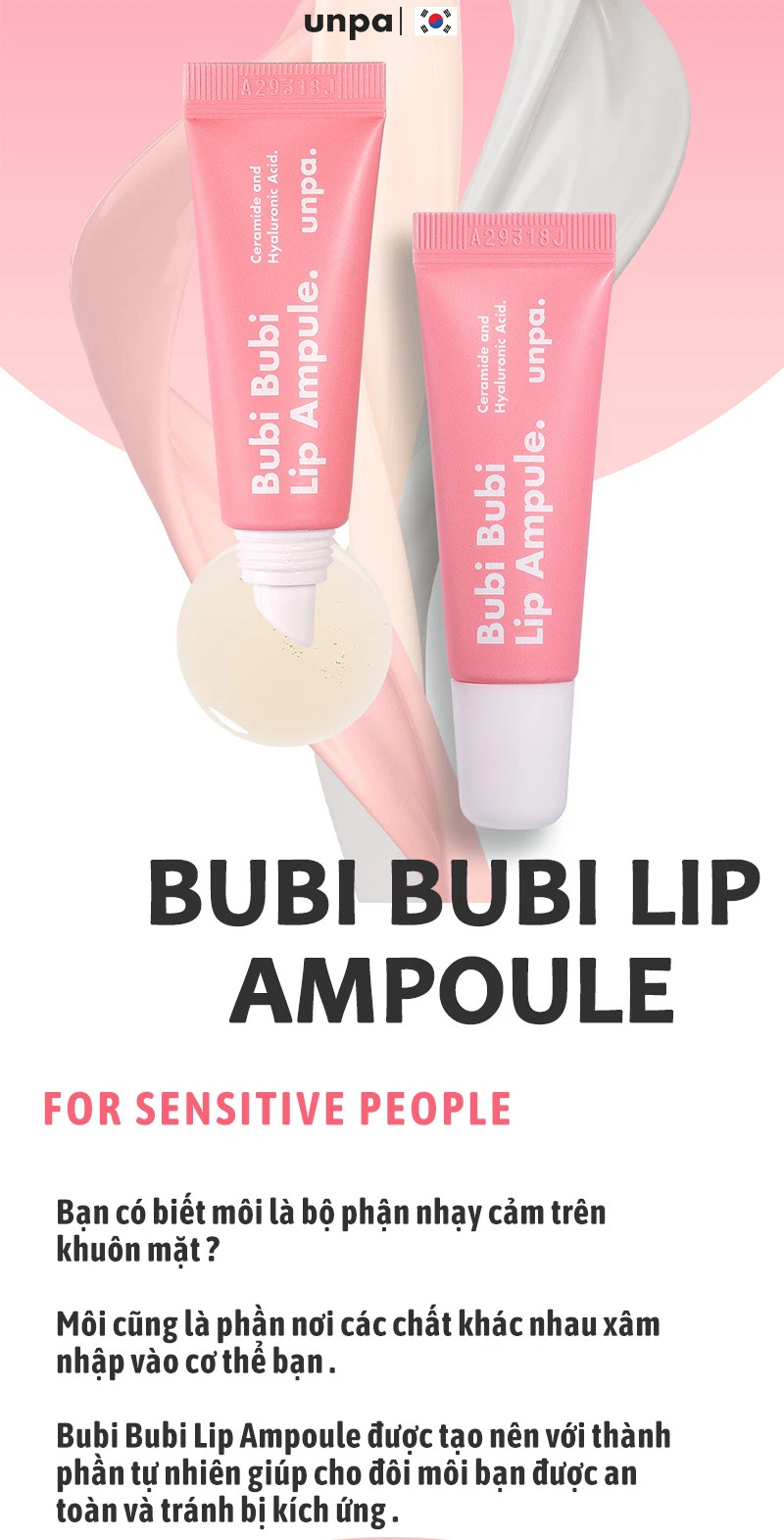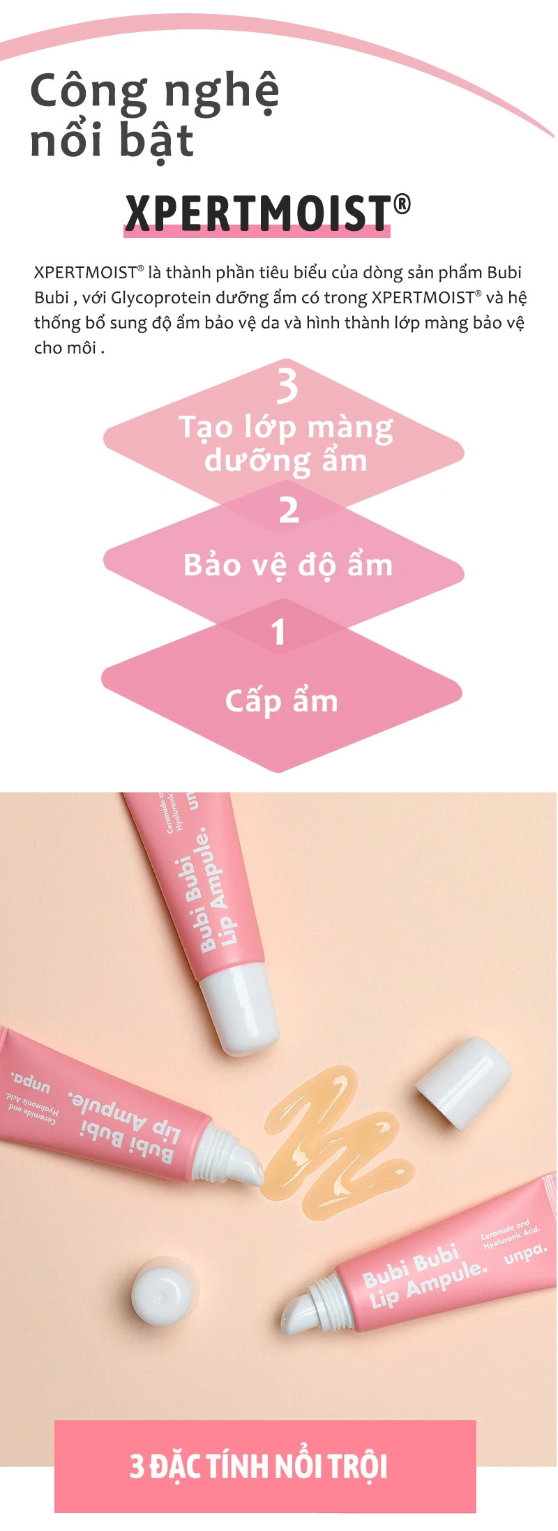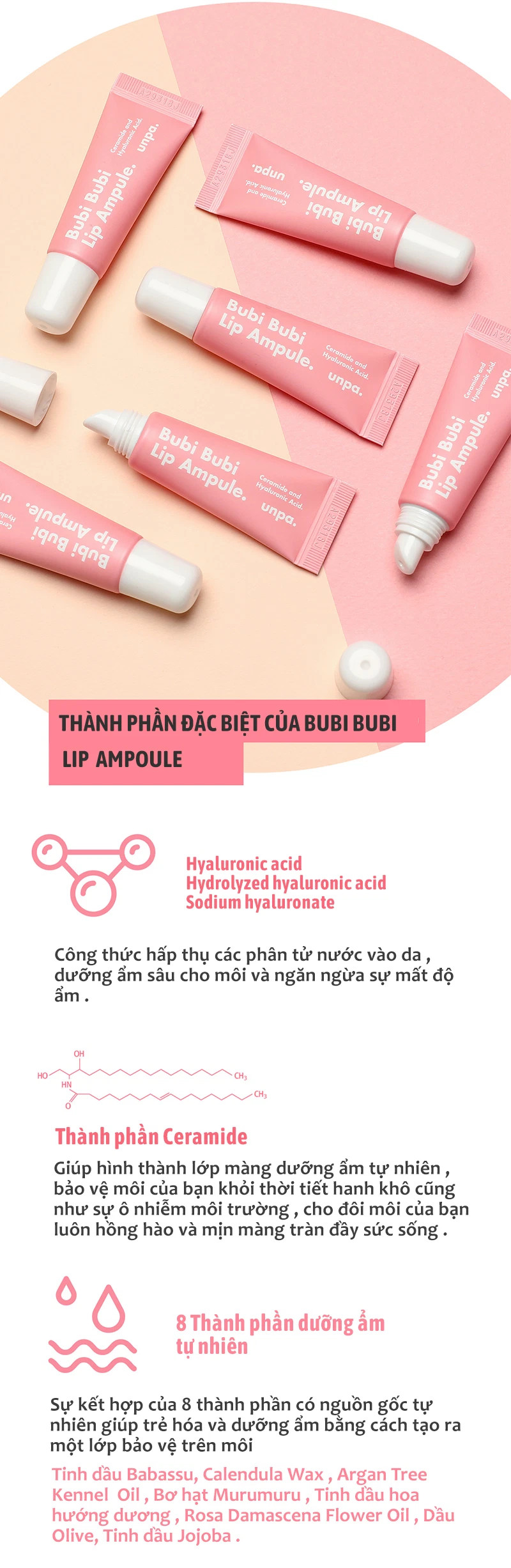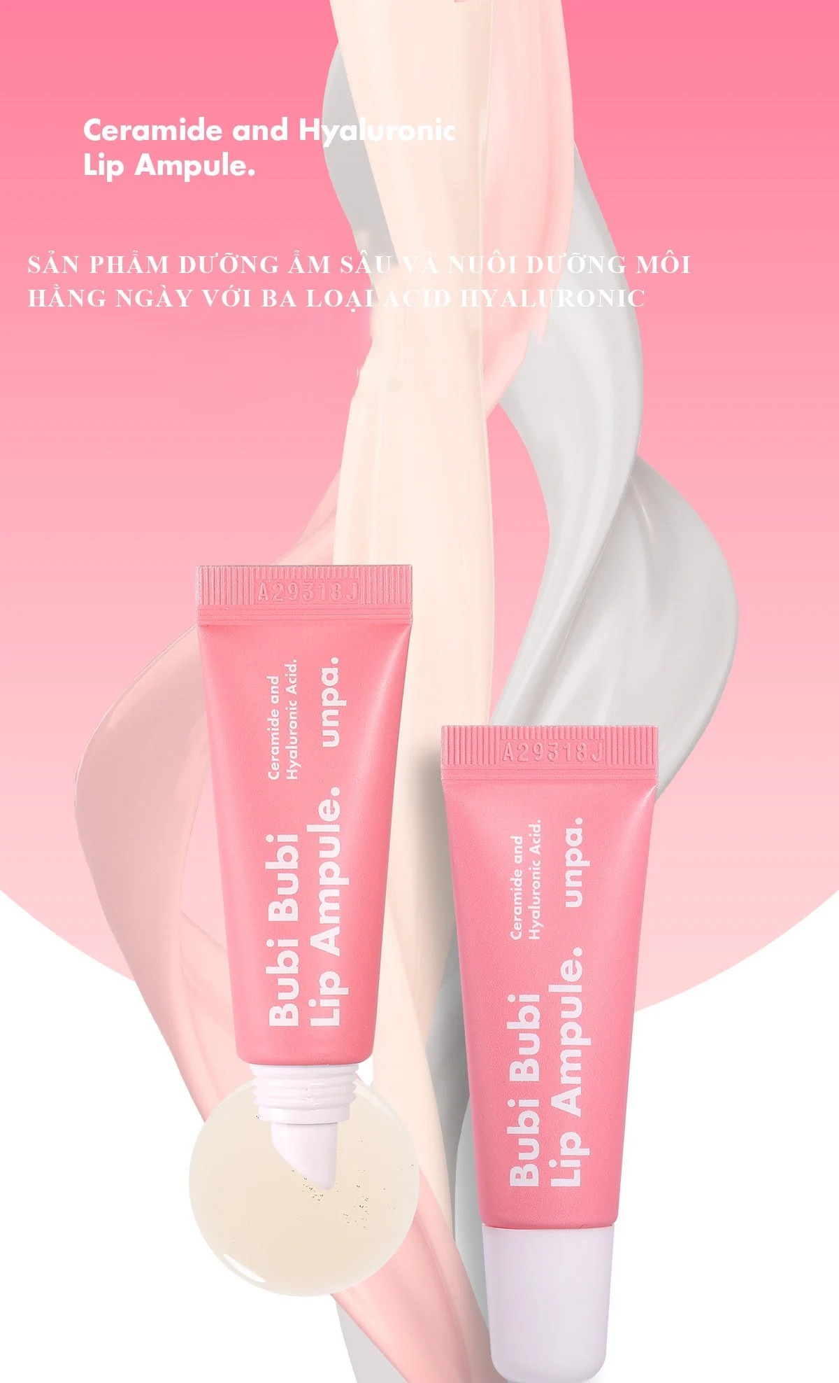 Son Dưỡng Dưỡng Ẩm Cho Môi Căng Mọng Unpa Bubi Bubi Lip Ampule là son dưỡng môi thuộc thương hiệu Unpa chứa thành phần Hyaluronic Acid có khả năng cấp nước tức thì cho môi với kết cấu tinh chất dạng gel cực kì mệ mại, nhẹ môi giúp dưỡng ẩm và duy trì độ ẩm cho môi, cải thiện làn môi khô ráp trở nên căng bóng, ẩm mượt và hồng hào tự nhiên.