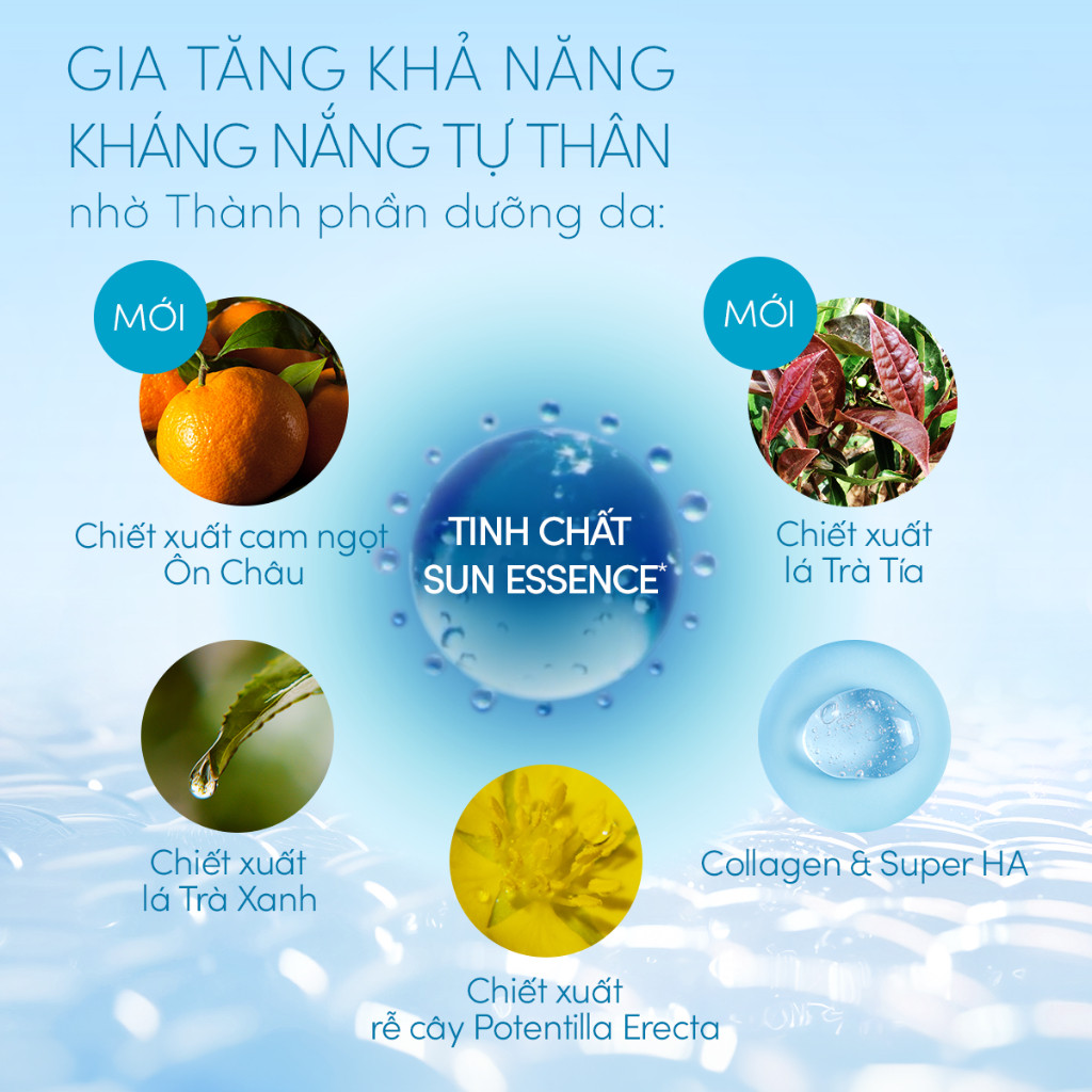 - Tinh chất Sun Essence: Chống mất nước 16H, chống oxy hóa và chống lão hóa, gia tăng khả năng kháng nắng tự nhiên của làn da.