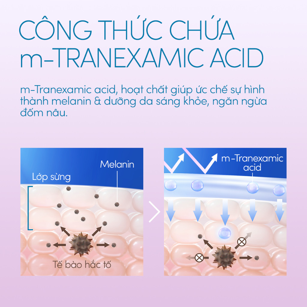 - Chứa m-Tranexamic acid giúp ức chế sản sinh hắc sắc tố melanin và cải thiện sự xuất hiện của đốm nâu.