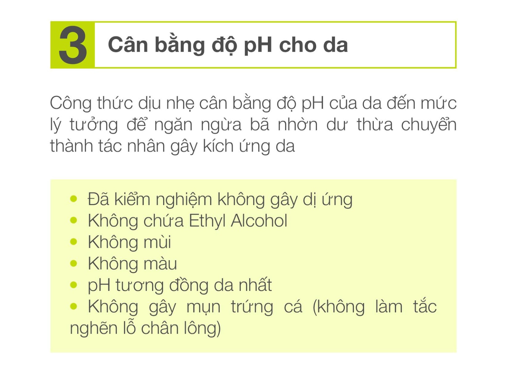 - Với bảng thành phần dịu nhẹ, được da liễu kiểm nghiệm không gây dị ứng, không mùi, không màu, không cồn vì vậy an toàn cho mọi loại da kể cả da nhạy cảm, có thể sử dụng ngay cả làn da mỏng manh của trẻ em