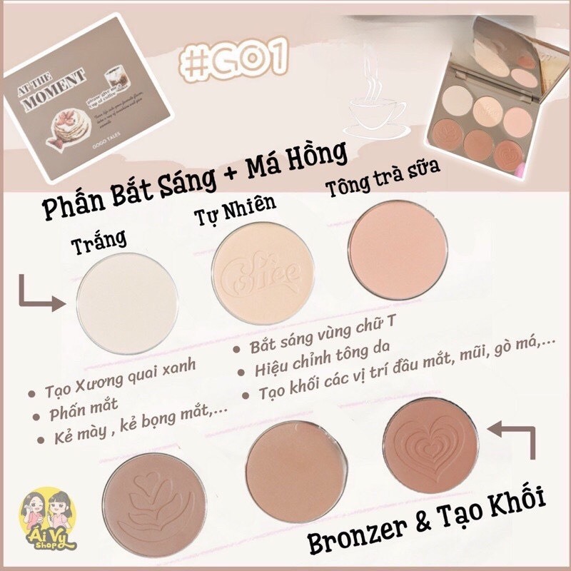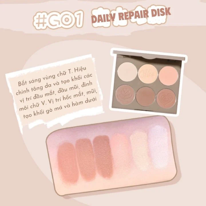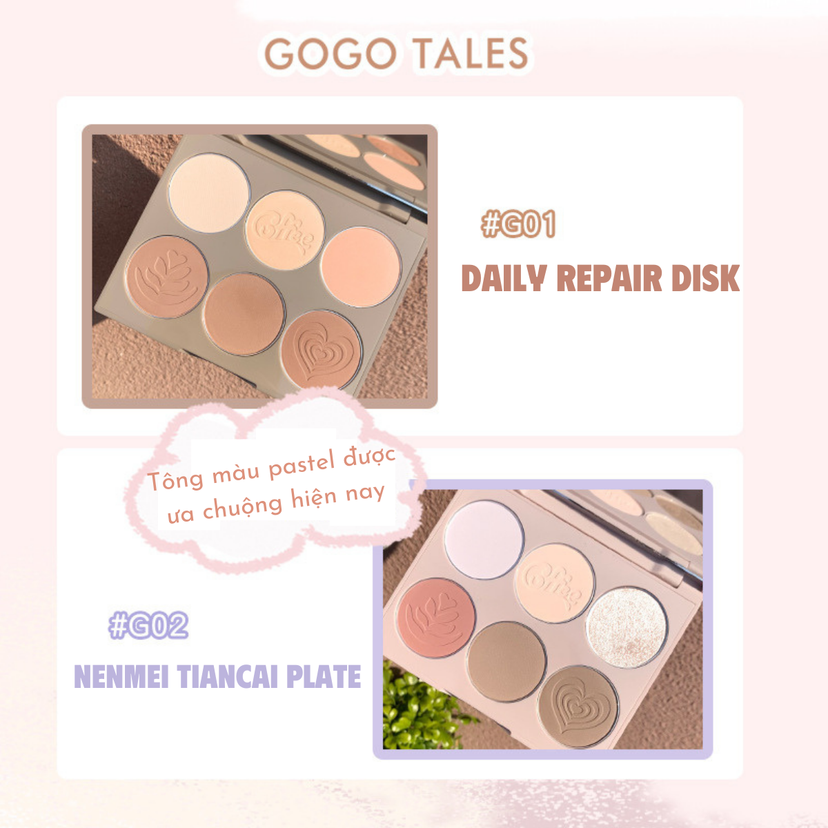 - Bảng Tạo Khối Gogo Tales 6 Ô Nude Light Shadow Highlight Contouring Disk GT445 16.8g là một sản phẩm đa năng khi có thể sử dụng để làm phấn mắt, phấn má, tạo khối và bắt sáng, giúp quá trình trang điểm trở nên thuận tiện và tiết kiệm hơn. Sản phẩm gồm 6 ô phấn, là sự kết hợp của phấn lì và phấn nhũ trong cùng một bảng phấn, giúp tạo chiều sâu và điểm nhấn cho các đường nét trên khuôn mặt trở nên thu hút và sắc sảo hơn.