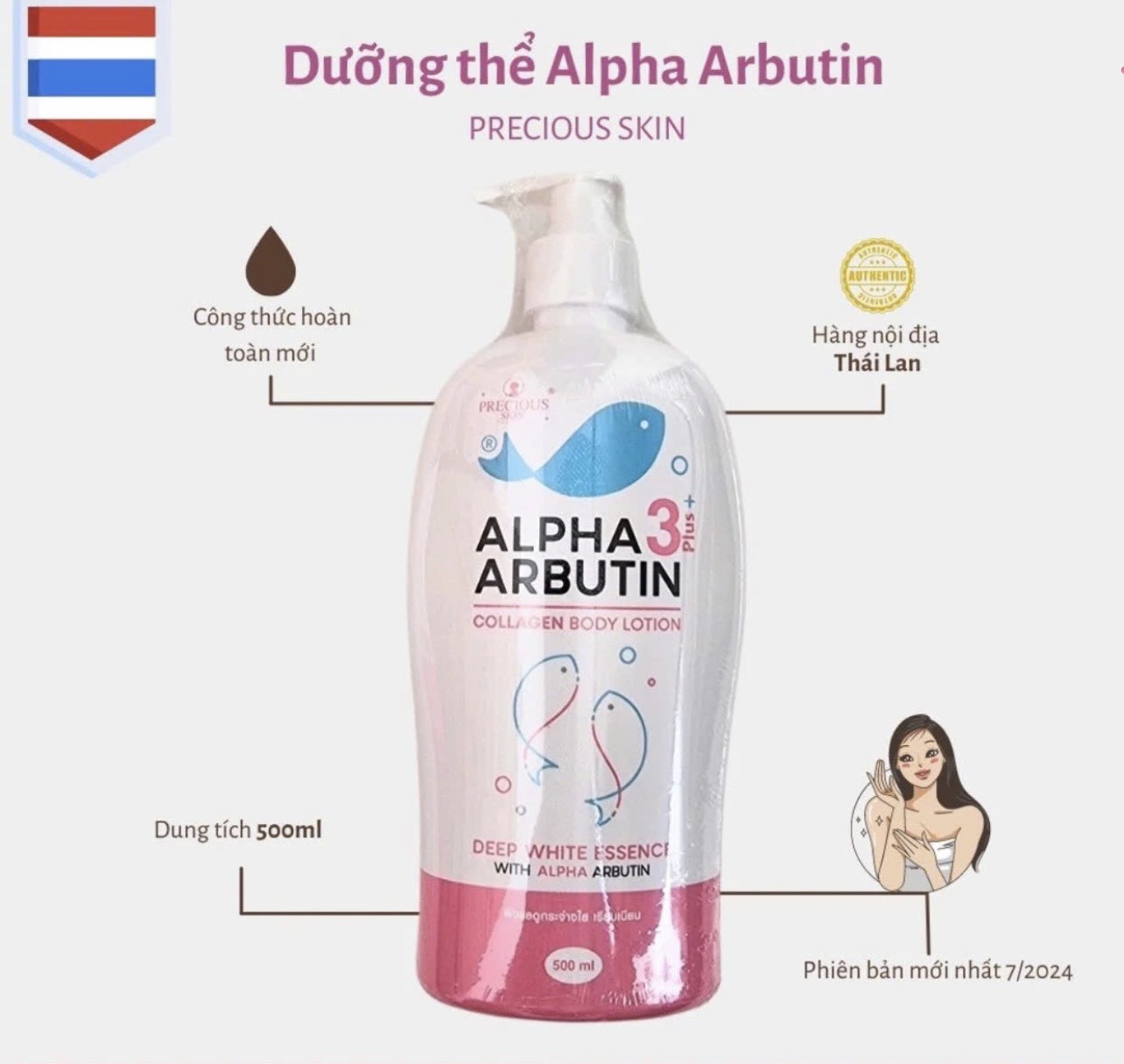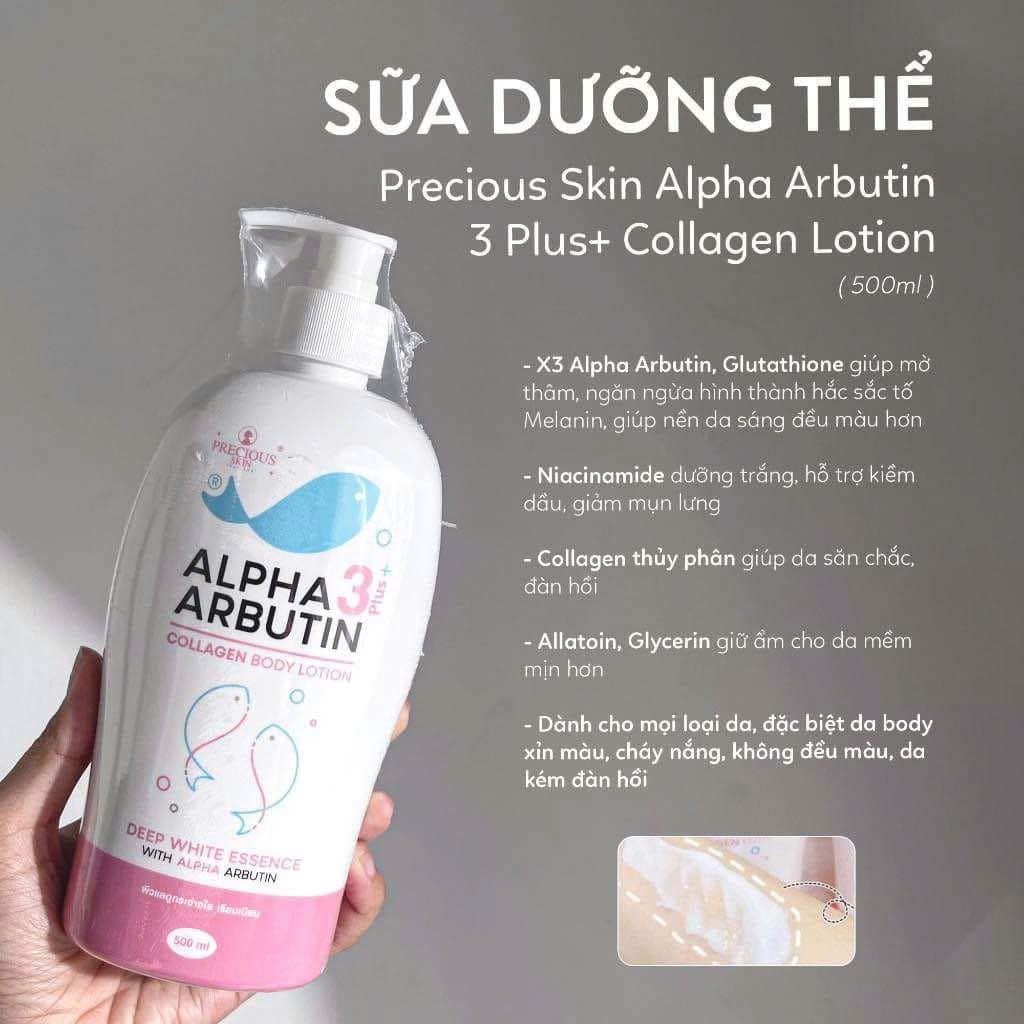 - Dưỡng Thể Precious Skin Thailand Alpha Arbutin Collagen Lotion 3 Plus 500ml chứa thành phần Alpha Arbutin hoạt chất dưỡng trắng, sáng da hiệu quả với cơ chế hoạt động an toàn và ít kích ứng hơn hydroquinone bằng cách ngăn sự hình thành của Melanin đồng thời phục hồi làn da nám, đốm nâu, không đều màu.