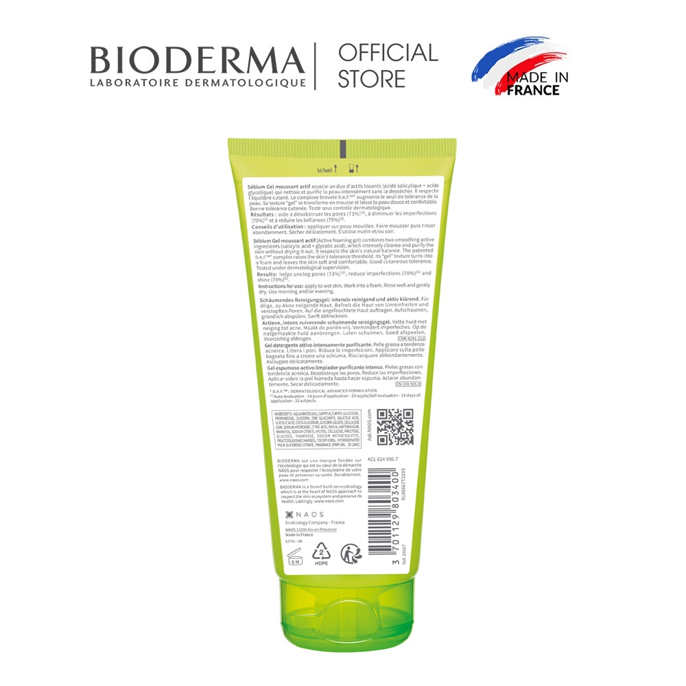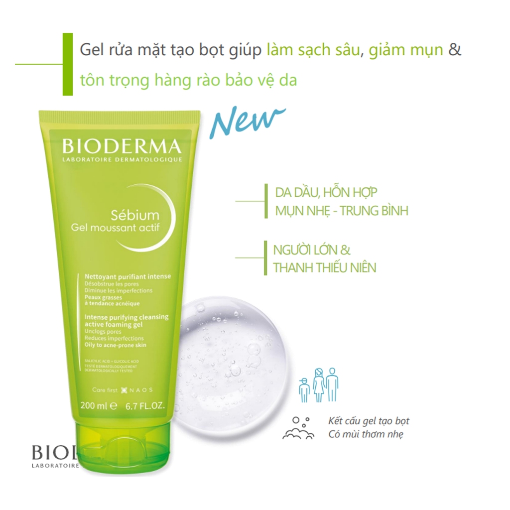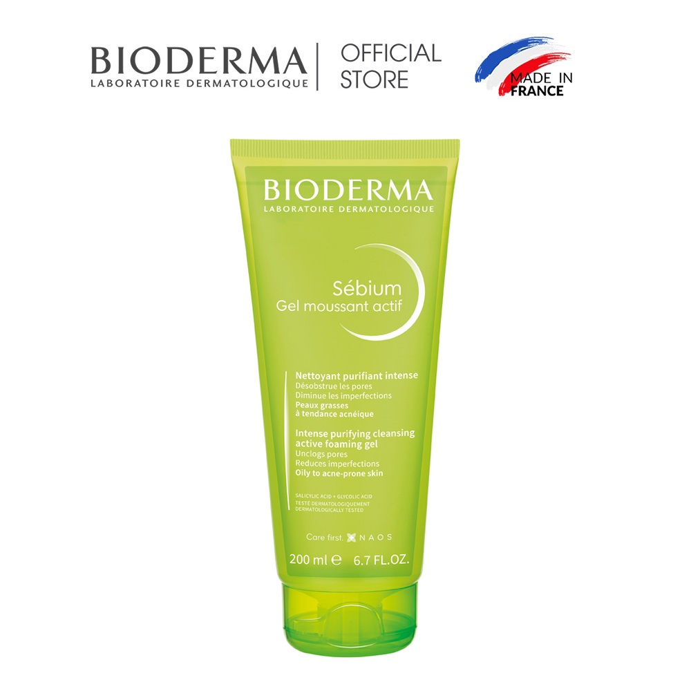 Gel Rửa Mặt Làm Sạch Sâu & Hỗ Trợ Giảm Mụn Bioderma Sebium Gel Moussant Actif 200ml là sữa rửa mặt dạng gel đến từ thương hiệu dược mỹ phẩm Bioderma giúp làm sạch sâu, làm sạch bụi bẩn, bã nhờn, tế bào chết giúp làm thông thoáng lỗ chân lông. Đồng thời công thức chứa thành phần AHA, BHA giúp tẩy tế chết cho da, hỗ trợ giảm mụn cho da, không gây khô da.