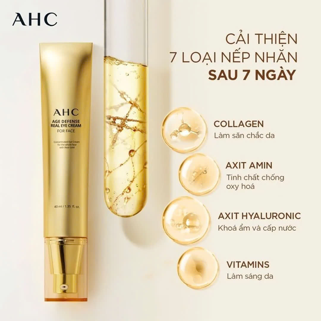 Kem Dưỡng Mắt AHC Age Defense Real Eye Cream For Face 40ml đến từ thương hiệu AHC của Hàn Quốc Giảm nếp nhăn và ngăn ngừa lão hóa: Giúp làm mờ các nếp nhăn hiện tại và ngăn chặn sự hình thành nếp nhăn mới, đặc biệt hiệu quả với các nếp nhăn nông.
