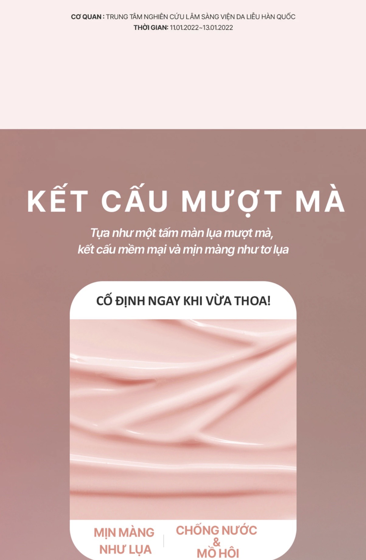 - Với 77% thành phần chứa dưỡng chất chăm sóc da có nguồn gốc tự nhiên, giúp lớp trang điểm nền lâu trôi mà không gây khô, bong tróc.