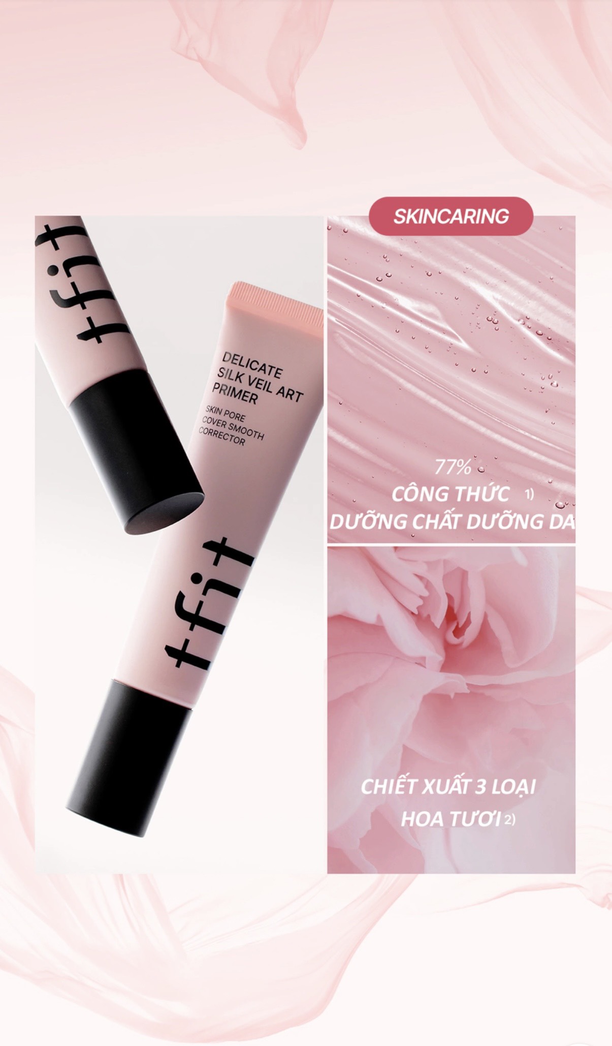 - Kem Lót TFIT Delicate Silk Veil Art Primer ngay lập tức thu nhỏ và xóa mờ hoàn hảo lỗ chân lông lớn. Nói lời tạm biệt luôn với lớp trang điểm dày nặng nề chỉ để che phẳng lỗ chân lông. Chào đón làn da mới hoàn hảo hơn, mịn màng hơn, sáng bừng hơn ngay sau khi sử dụng!