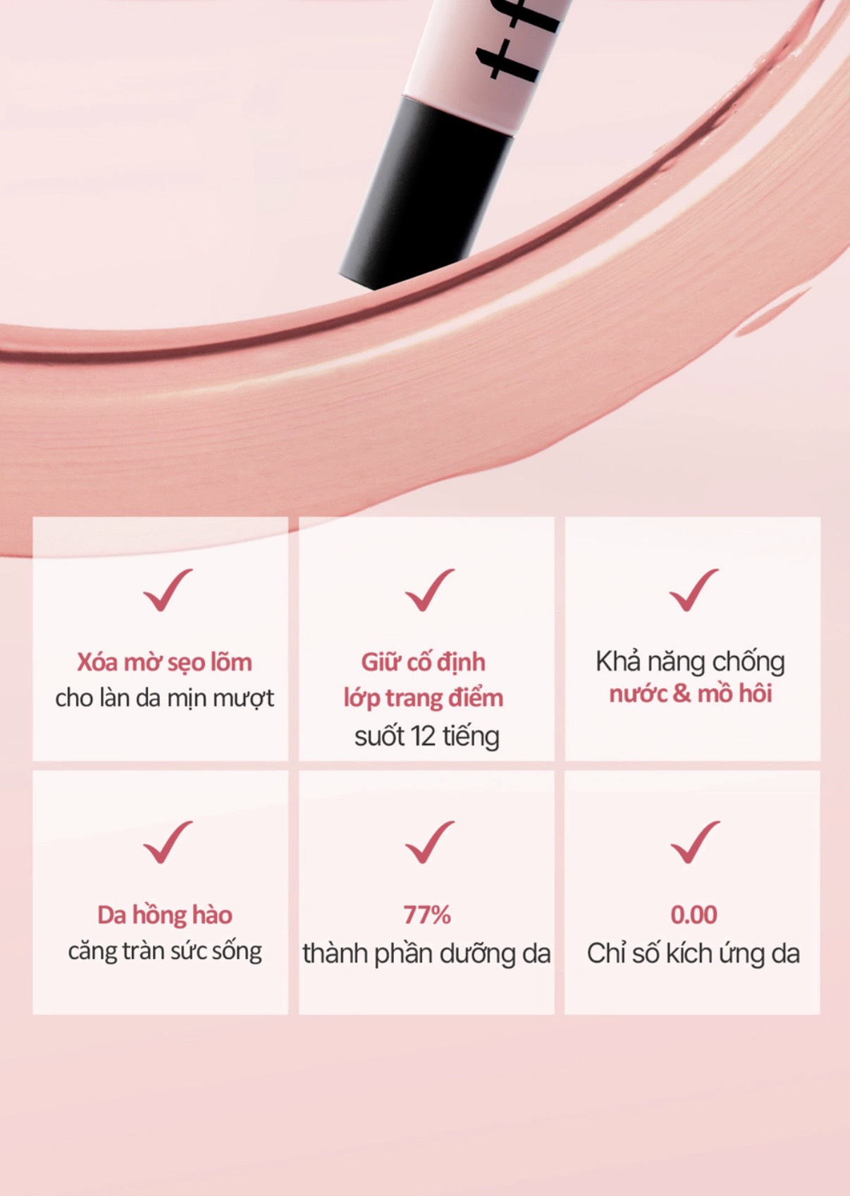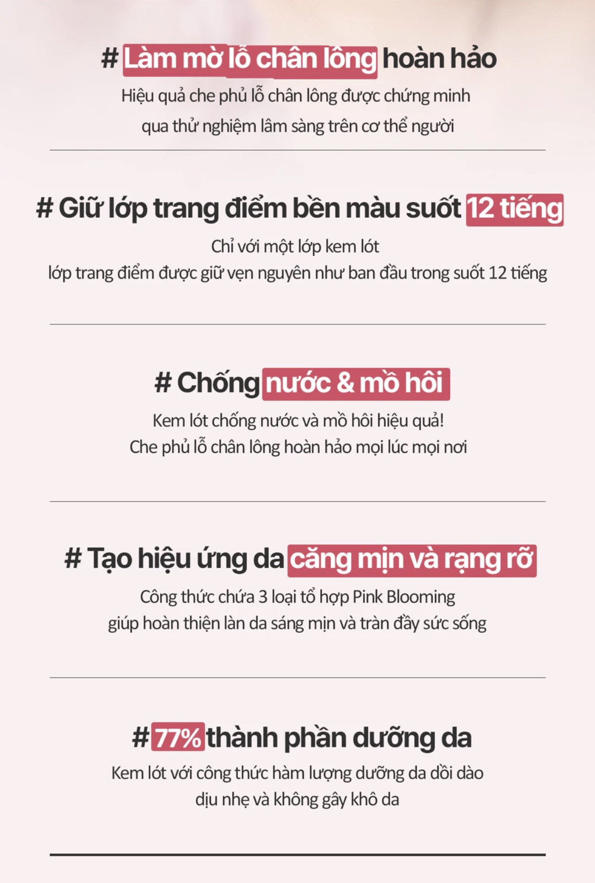 - Chứa tới 3 loại bột hồng chiết xuất từ hoa, làm đều màu da và sáng tông da, trả lại làn da hồng hào. Nếu bạn đang tìm kiếm loại kem lót giúp làn da trong trẻo và thu nhỏ lỗ chân lông thì loại kem lót này chính là dành cho bạn.