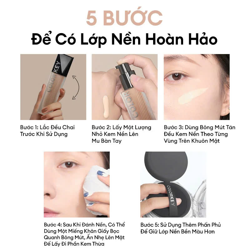 Tán đều kem bằng cọ, mút hoặc đầu ngón tay theo chuyển động tròn để lớp nền tự nhiên.