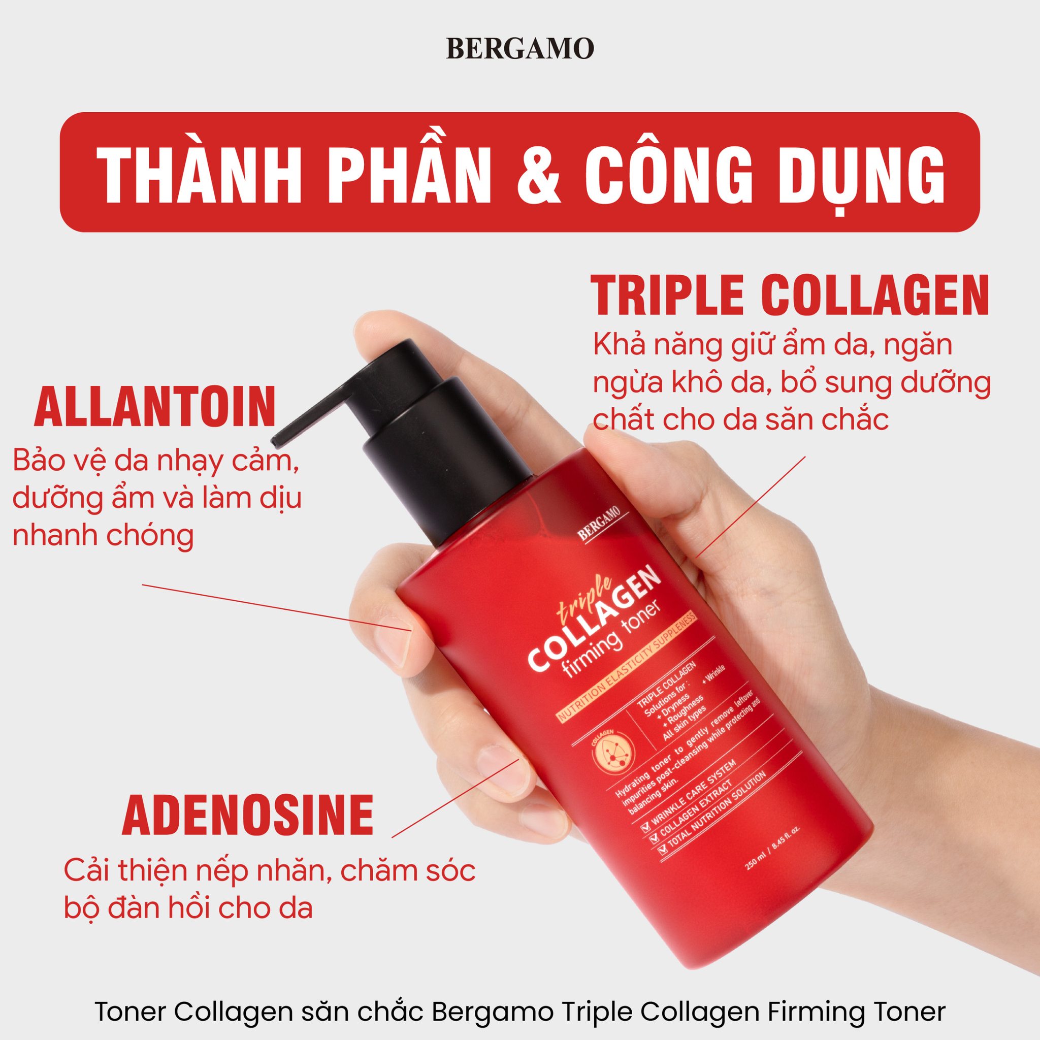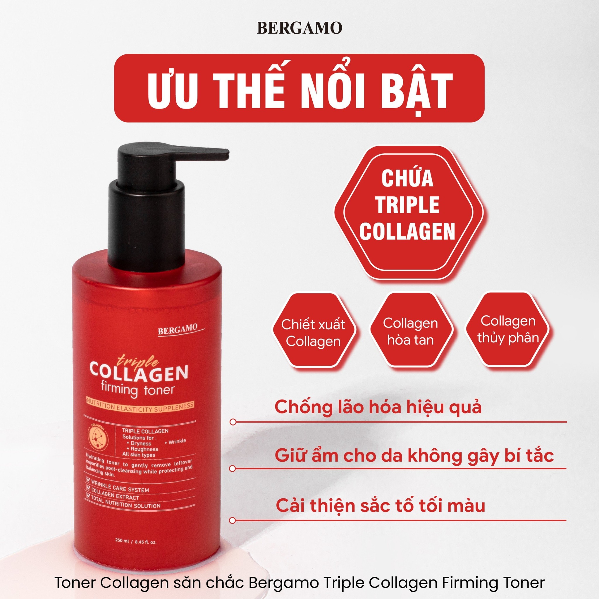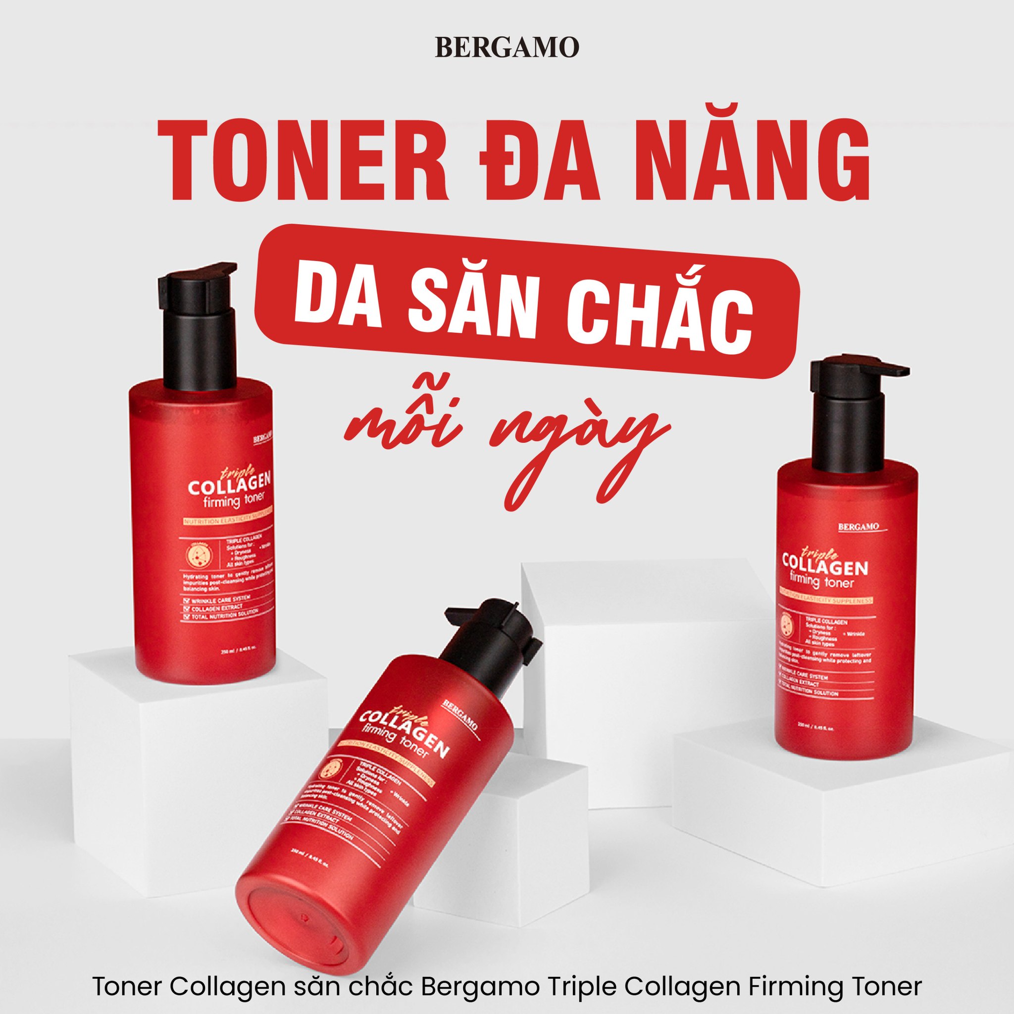 Toner Collagen Săn Chắc Bergamo Triple Collagen Firming Toner 250ml là sản phẩm nước hoa hồng đến từ thương hiệu Bergamo - Thương hiệu mỹ phẩm uy tín và lâu đời tại Hàn Quốc. Nước hoa hồng Triple Collagen Firming Toner có chứa Collagen chiếm khoảng 40% protein cấu thành cơ thể chúng ta, chiếm khoảng 90% lớp biểu bì da, là thành phần cần thiết cho làn da đàn hồi và đóng vai trò quan trọng cho sự liên kết các mô da cùng với Elastin và Hyaluronic Acid.