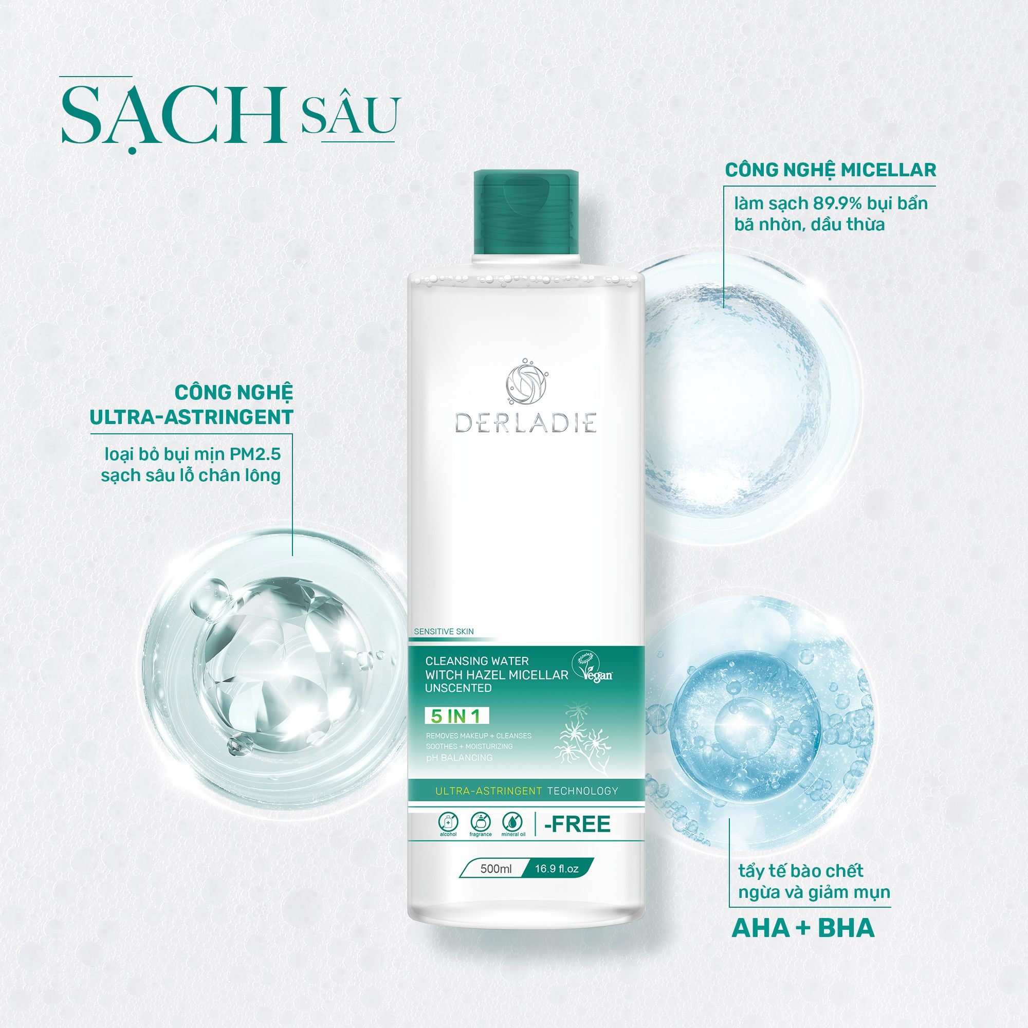 Không chỉ đơn thuần là sản phẩm làm sạch, tẩy trang Derladie Cleansing Water Witch Hazel Micellar Unscented mang đến giải pháp TẨY TRANG CHUẨN CHUYÊN GIA độc quyền dành cho làn da đang bị mụn. Công thức AN TOÀN + làm sạch TỐI ƯU + chăm da DỊU NHẸ, sản phẩm hướng đến 1 lựa chọn phù hợp dành riêng cho da dầu mụn Việt Nam - “MỘT LƯỚT DỊU ÊM - SẠCH SÂU DA MỤN”!