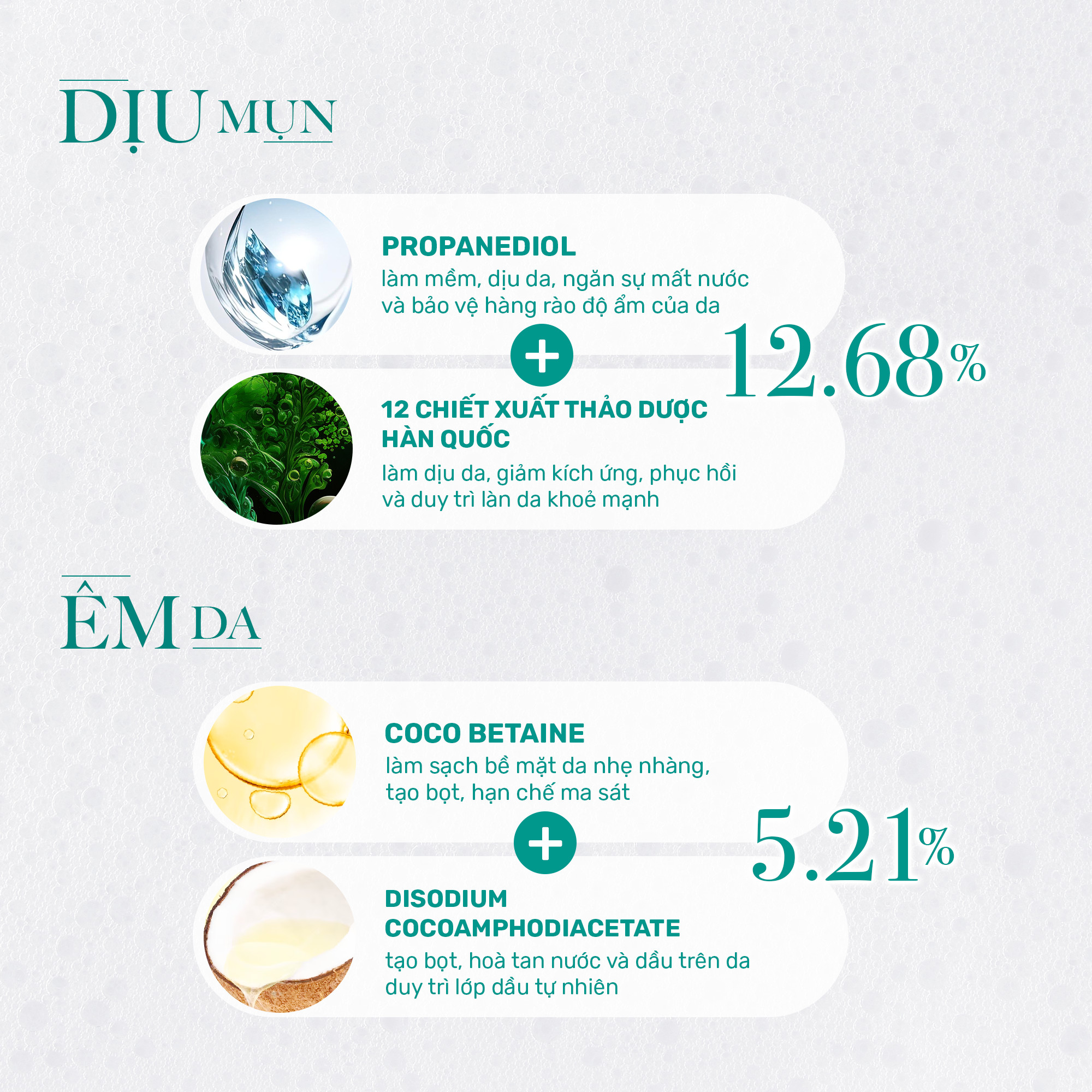 - CƠ CHẾ ÊM DA: 5.21% Coco Betaine và Disodium Cocoamphodiacetate (hoạt chất làm sạch từ gốc dầu dừa) tạo bọt, hạn chế ma sát, củng cố hàng rào ẩm của da.