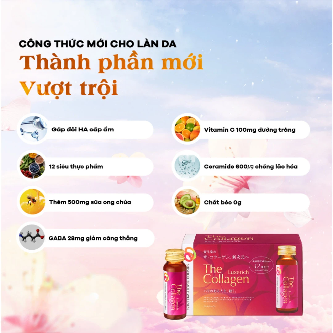 Nước Uống Bổ Sung Collagen Shiseido The Collagen 50mL x 10 lọ giúp bổ sung Collagen & HA cần thiết cho cơ thể, không chỉ hỗ trợ làm đẹp, duy trì làn da trẻ trung, căng sáng mà còn tốt cho vận động. Sản phẩm dạng nước hấp thu nhanh, được mix từ các loại trái cây có lợi cho sức khỏe, có hương vị thơm ngon, dễ uống.