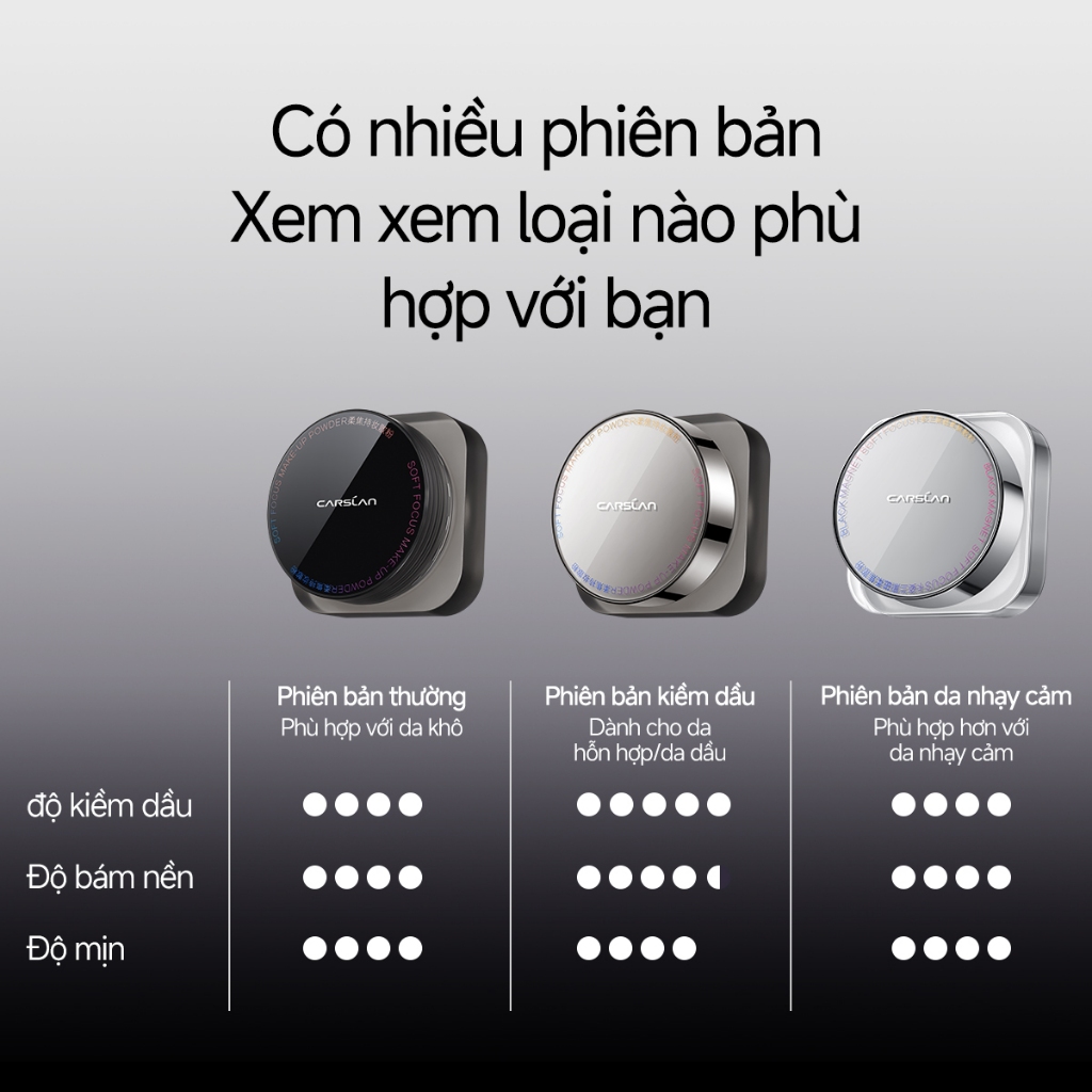 Phấn Bột Kiềm Dầu, Chống Nước, Chống Mồ Hôi CARSLAN Soft Focus Make-Up Powder 8g. Là thương hiệu mỹ phẩm hàng đầu tại Trung Quốc, Carslan bắt kịp xu hướng thế giới và tập trung vào việc khám phá và thể hiện vẻ đẹp. Truyền tải năng lượng tích cực của thời trang và vẻ đẹp cho con người hiện đại.