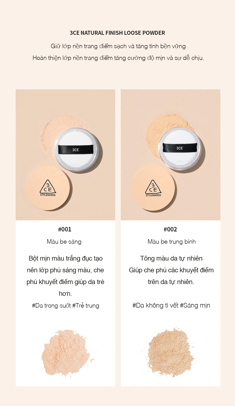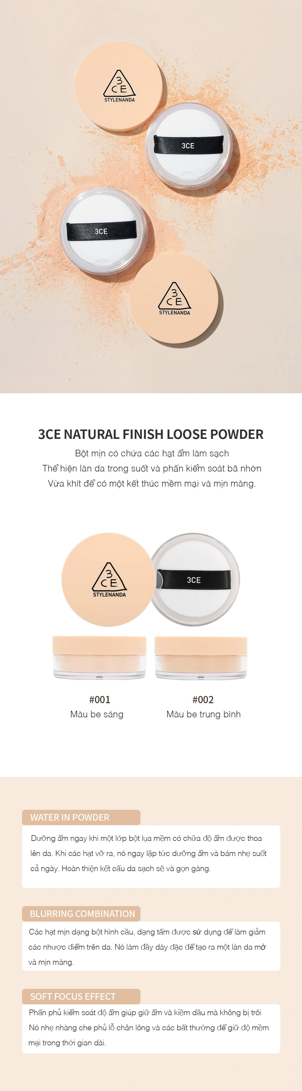 - Phấn Phủ 3CE Natural Finish Loose Powder giữ lớp trang điểm lâu trôi dù có bị đổ dầu, mồ hôi hay gặp nước suốt cả ngày.