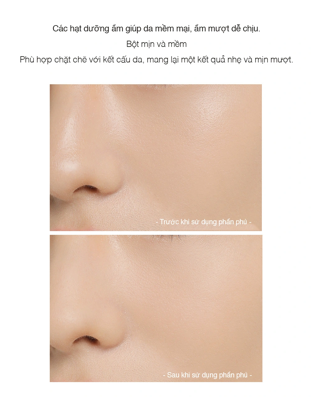 - Với thành phần chứa hạt phấn bột siêu mịn dưỡng ẩm, mang đến lớp nền cực kỳ thông thoáng, kiềm dầu tốt không bóng nhờn, giữ màu tốt không bị xuống tone.