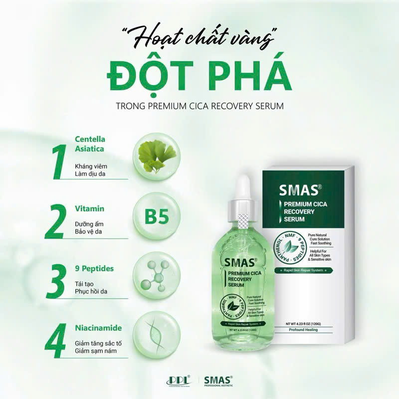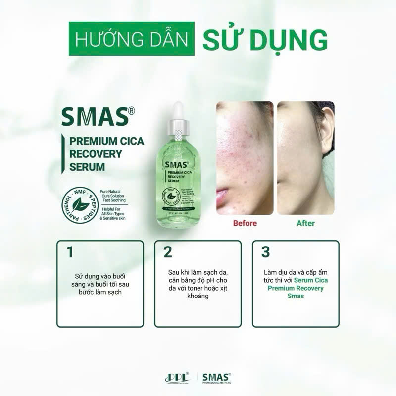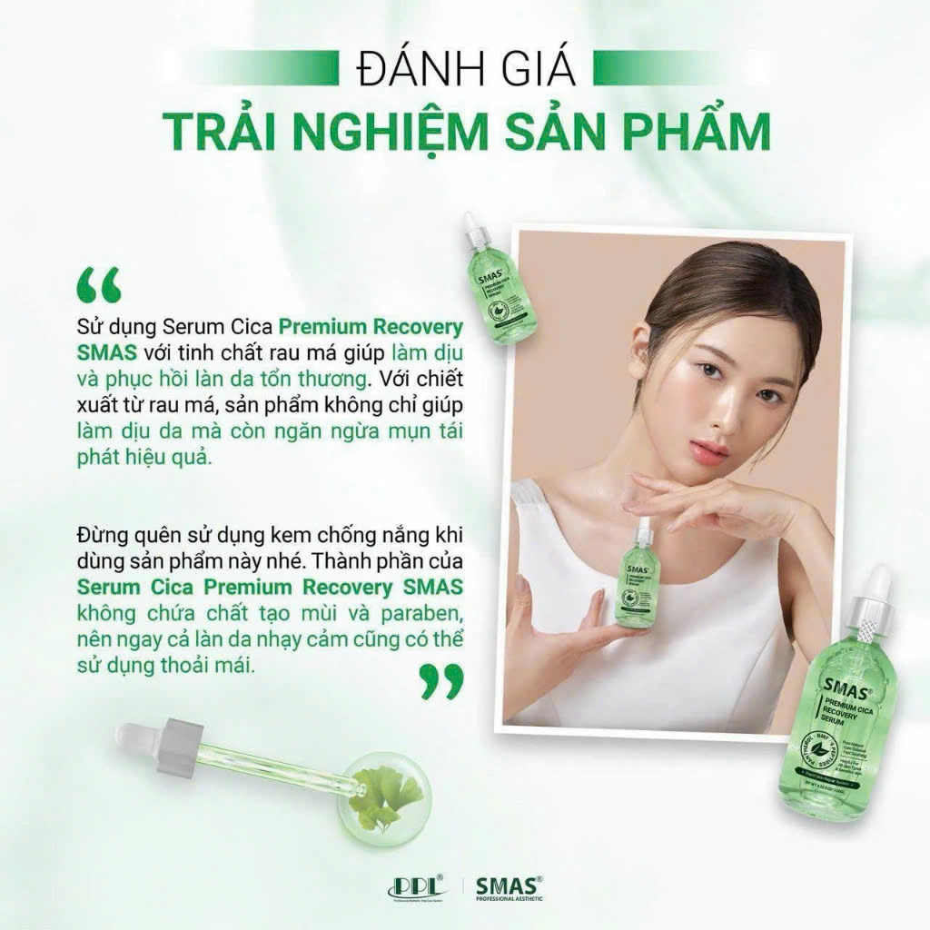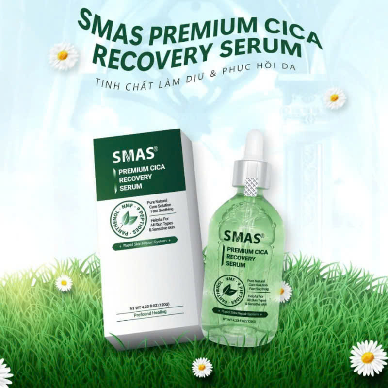 Serum Phục Hồi Làm Dịu Smas Premium Cica Recovery 100ml đến từ thương hiệu Smas thương hiệu dược mỹ phẩm đến từ Hàn Quốc, chiết xuất rau má giúp phục hồi da, làm dịu kích ứng và cải thiện hàng rào bảo vệ da, mang đến làn da khỏe mạnh, mịn màng và tràn đầy sức sống.
