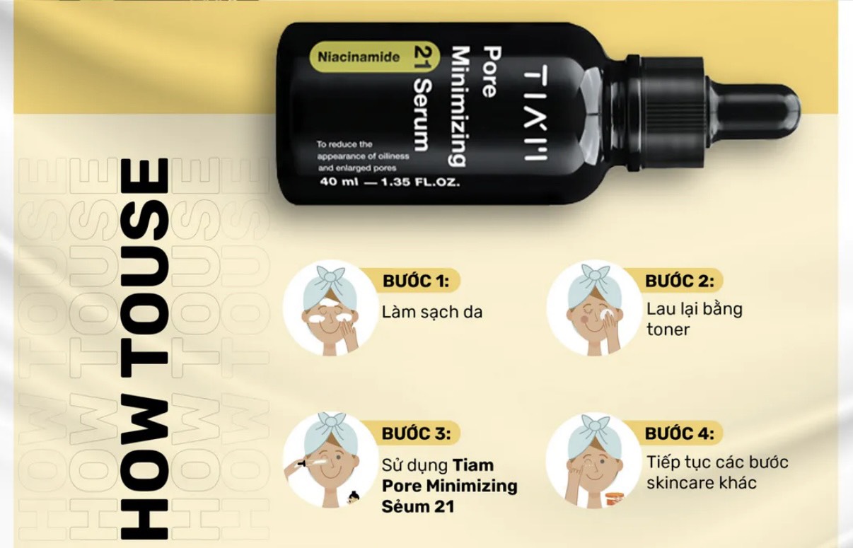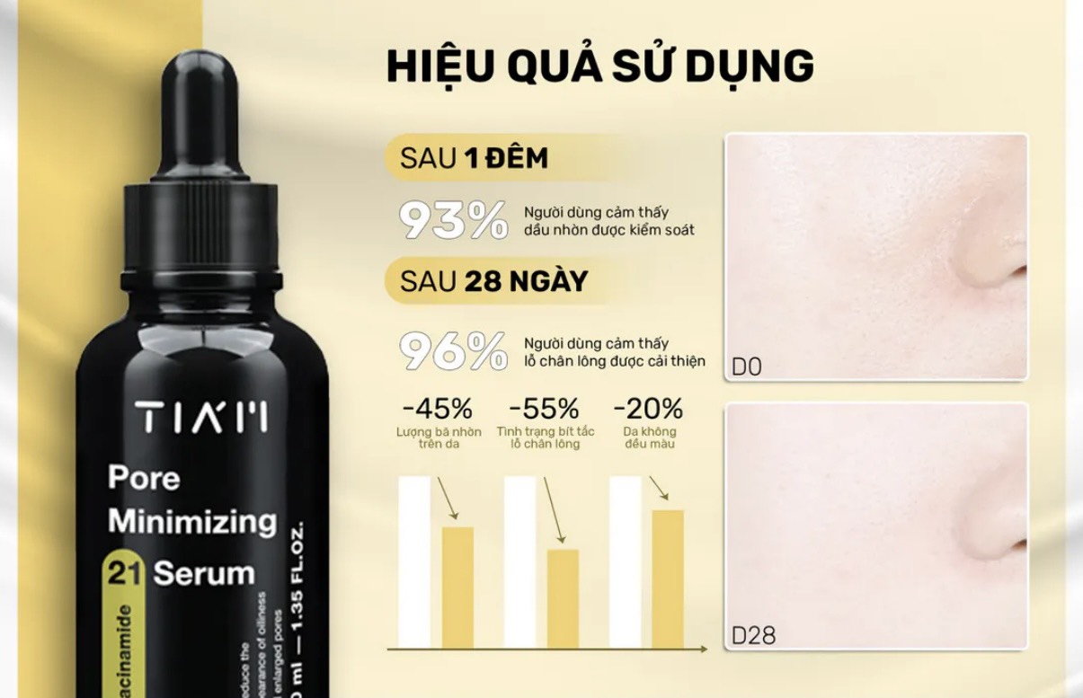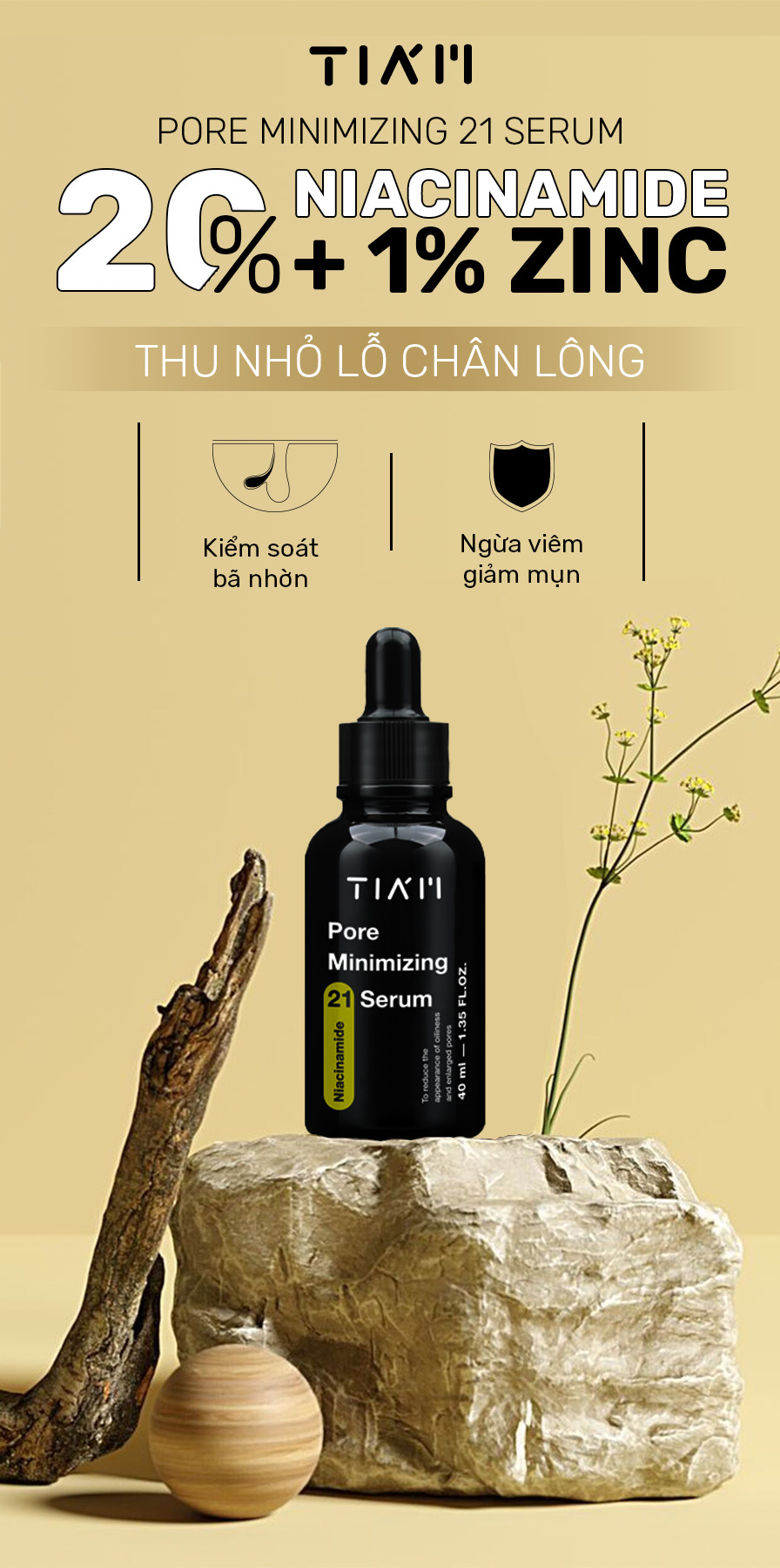 - Serum Tiam Tinh Chất Kiểm Soát Dầu Nhờn Niacinamide 20% Tiam Pore Minimizing 21 Serum với Niacinamide 20% nồng độ cao có công dụng điều tiết lượng dầu thừa trên da, giúp thu nhỏ lỗ chân lông, cải thiện tình trạng bít tắc lỗ chân lông, hỗ trợ làm đều màu da và làm sáng da, hỗ trợ giảm viêm và phục hồi da bị yếu, hư tổn.