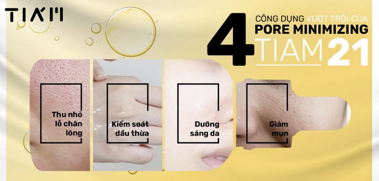 - Hô biến lỗ chân lông "QUÁ CỠ" với công thức độc quyền của TIAM Pore Minimizing 21 Serum. Với 3 cơ chế toàn diện giúp lỗ chân lông thu nhỏ: