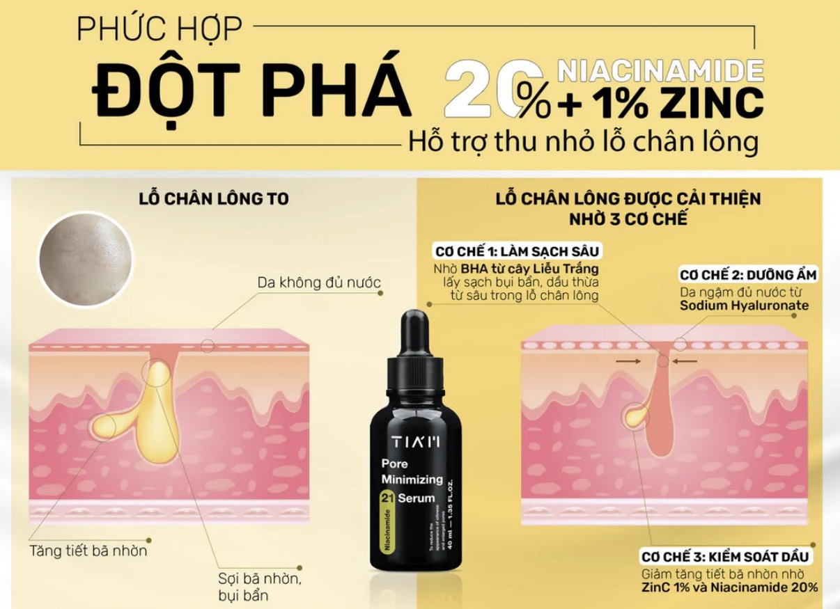 + Cơ chế 1: GIẢM DẦU với Niacinamide 20% + 1% Zinc PCA: giúp điều tiết bã nhờn trên da, giảm sự hoạt động của lỗ chân lông.