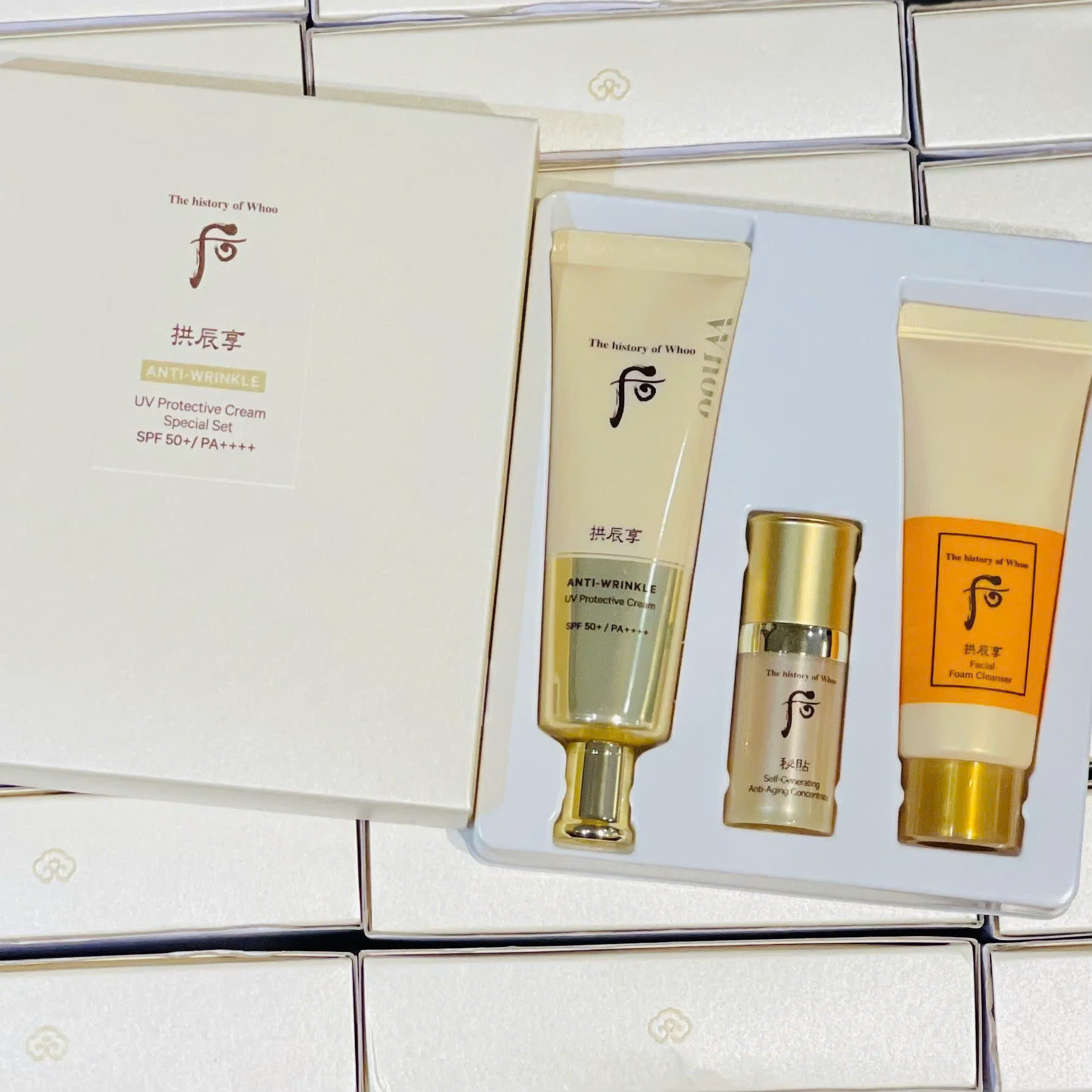 Set Chống Nắng Whoo Anti - Wrinkle SPF50+/PA+++ đến từ thương hiệu The History of Whoo của một nhãn hiệu mỹ phẩm cao cấp đến từ Hàn Quốc. Với công dụng nổi bật bảo vệ hoàn hảo bằng cách giảm tác hại từ tia UVA là nguyên nhân chính gây ra đốm nâu, tàn nhang.