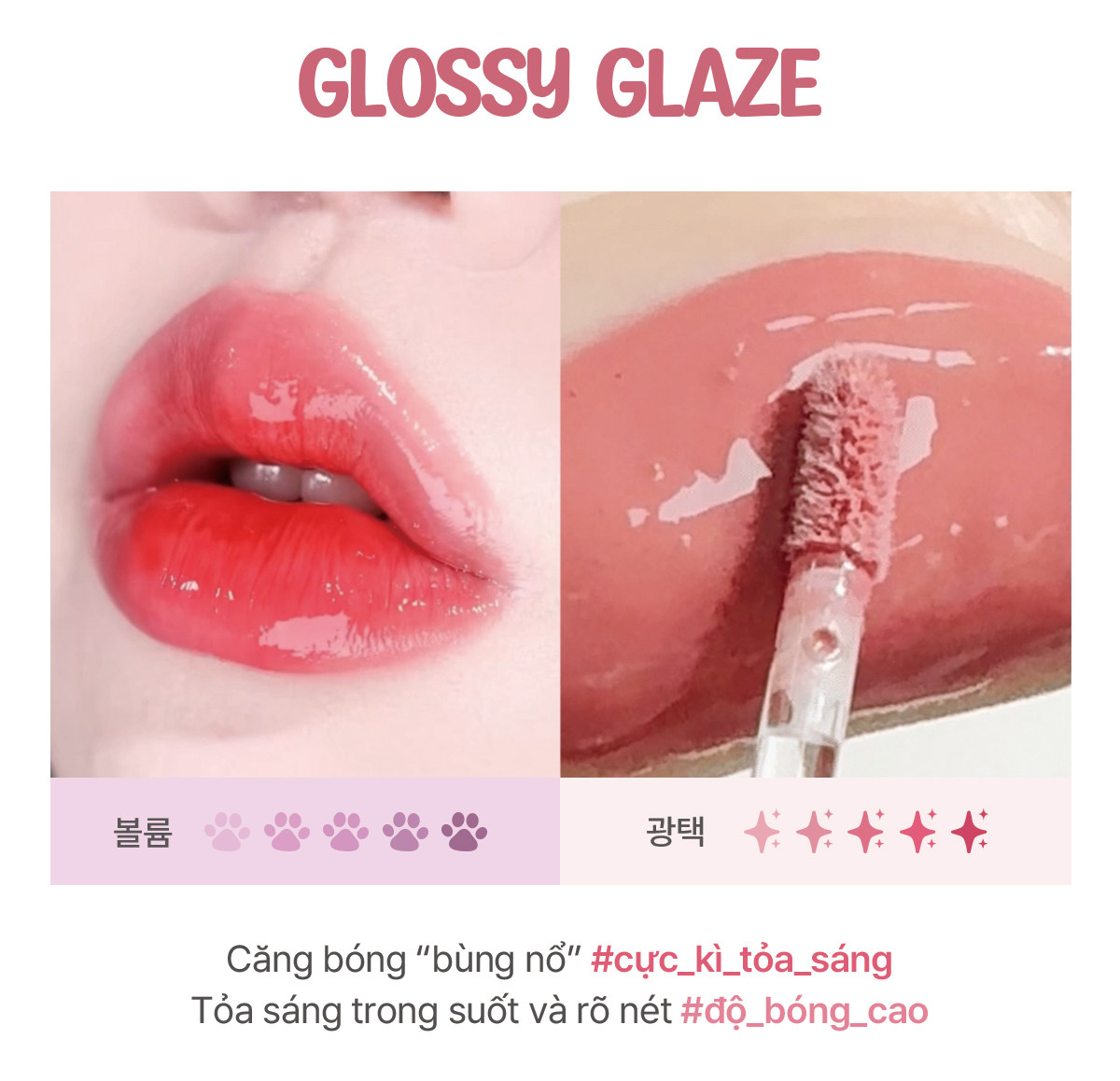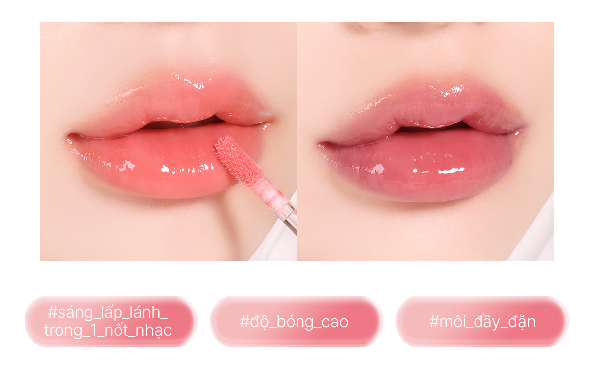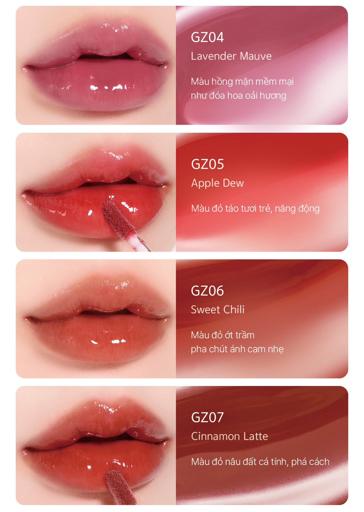 - Chất son bóng mịn, tạo cảm giác đàn hồi, đầy môi. Chất son chứa dưỡng chất giúp môi căng bóng, che phú rãnh môi và không làm khô môi. Chất son mỏng nhẹ nên có thể dùng Muddish Cushion Velvet làm base và sau đó apply Chewy Lip Glaze để tạo độ bóng.