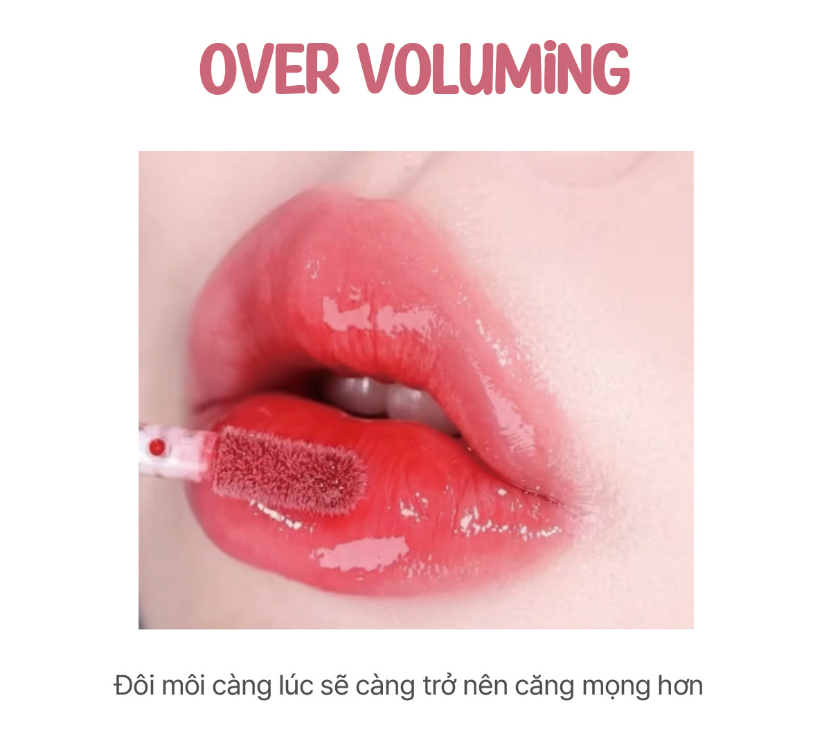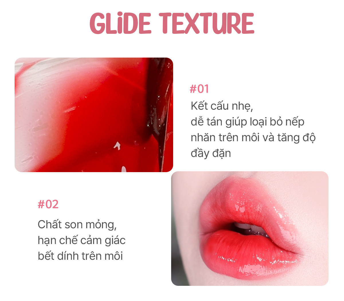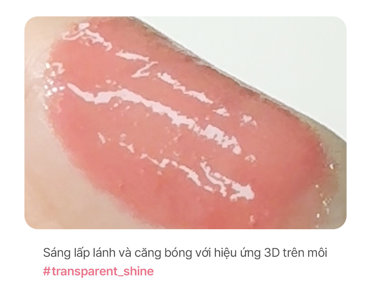- Chất son bóng mịn, tạo cảm giác đàn hồi, đầy môi. Chất son chứa dưỡng chất giúp môi căng bóng, che phú rãnh môi và không làm khô môi. Chất son mỏng nhẹ nên có thể dùng Muddish Cushion Velvet làm base và sau đó apply Chewy Lip Glaze để tạo độ bóng.