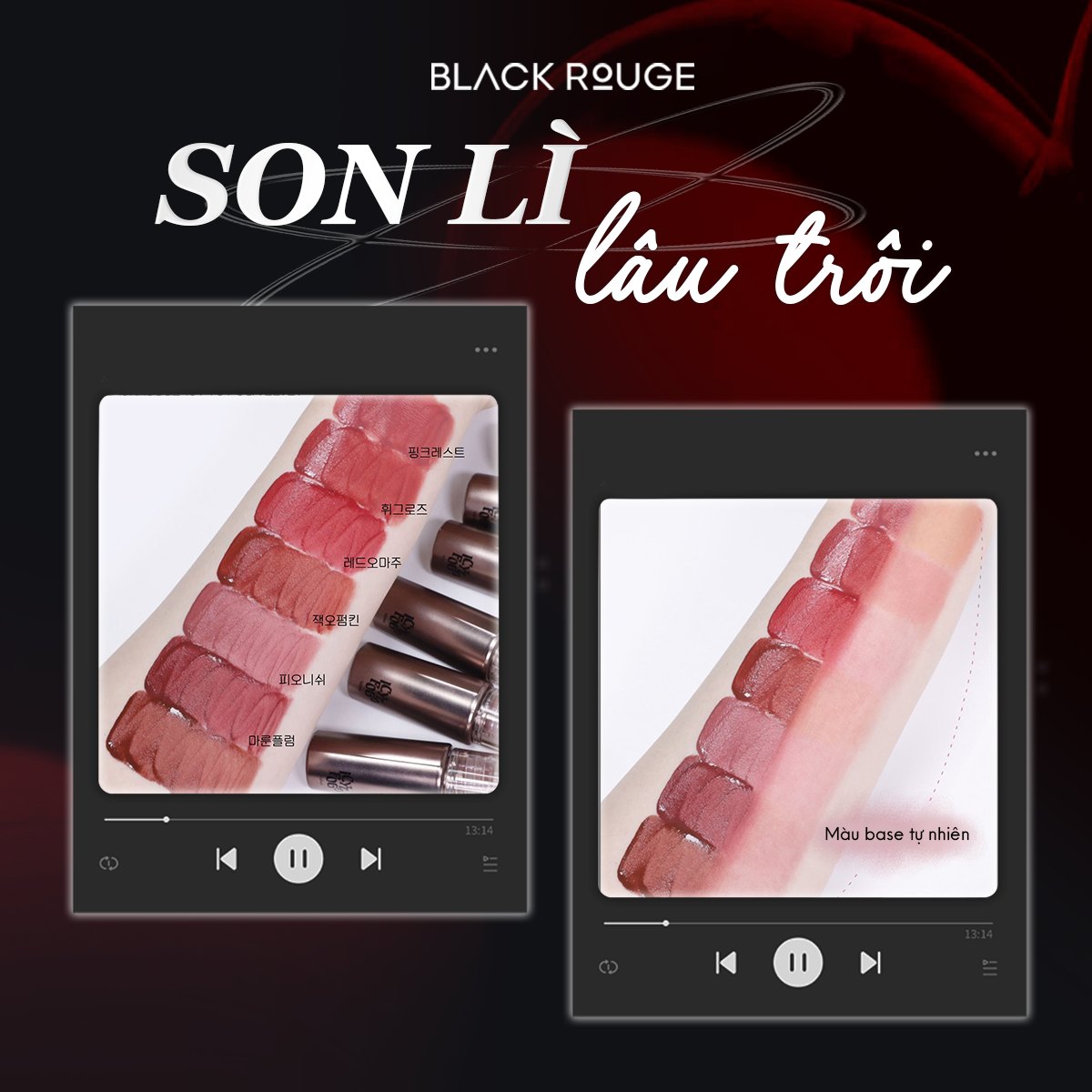 - Son bám màu tốt từ 3-4 tiếng khi không ăn uống. Son lên màu chuẩn tuỳ vào sắc tố môi. Black Rouge đề cao sự dưỡng môi, chất son có thể dùng làm má hồng và có thể tán một cách dễ dàng, không set lại quá nhanh.