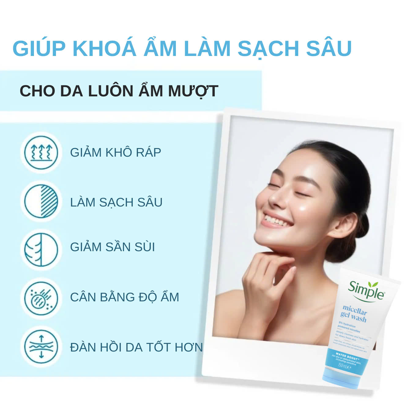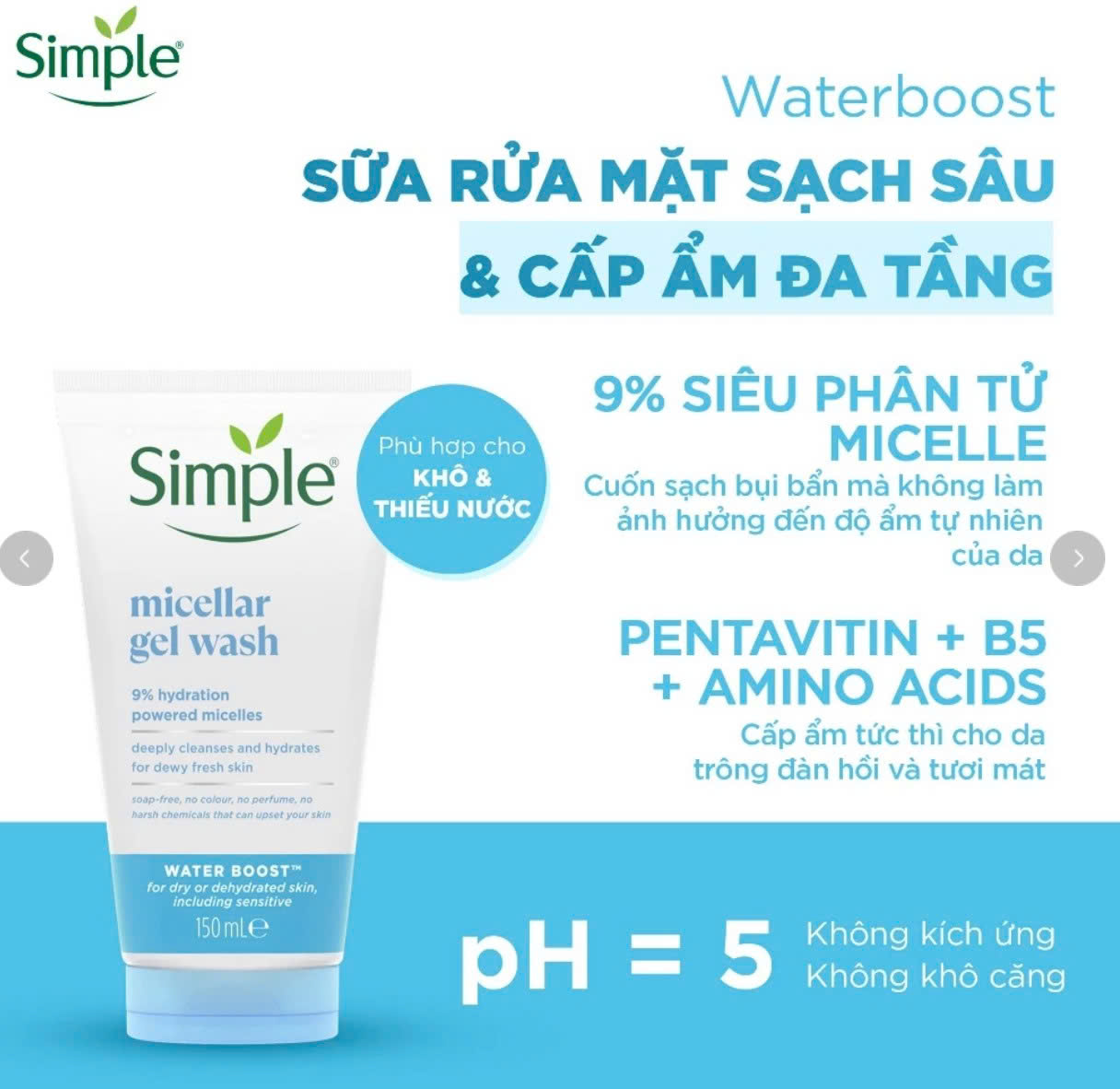 Sữa Rửa Mặt Sạch Sâu Và Cấp Ẩm Cho Da Khô Simple Water Boost 150ml là sự lựa chọn hoàn hảo dành cho những ai có làn da khô, thiếu ẩm. Với công thức dịu nhẹ, sản phẩm giúp làm sạch sâu mà vẫn duy trì độ ẩm tự nhiên cho da, mang lại làn da mềm mại, tươi mới và không cảm giác căng rít sau khi sử dụng.