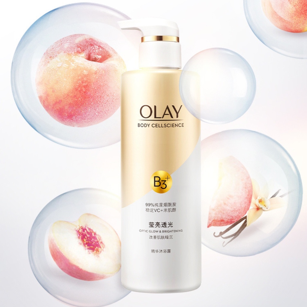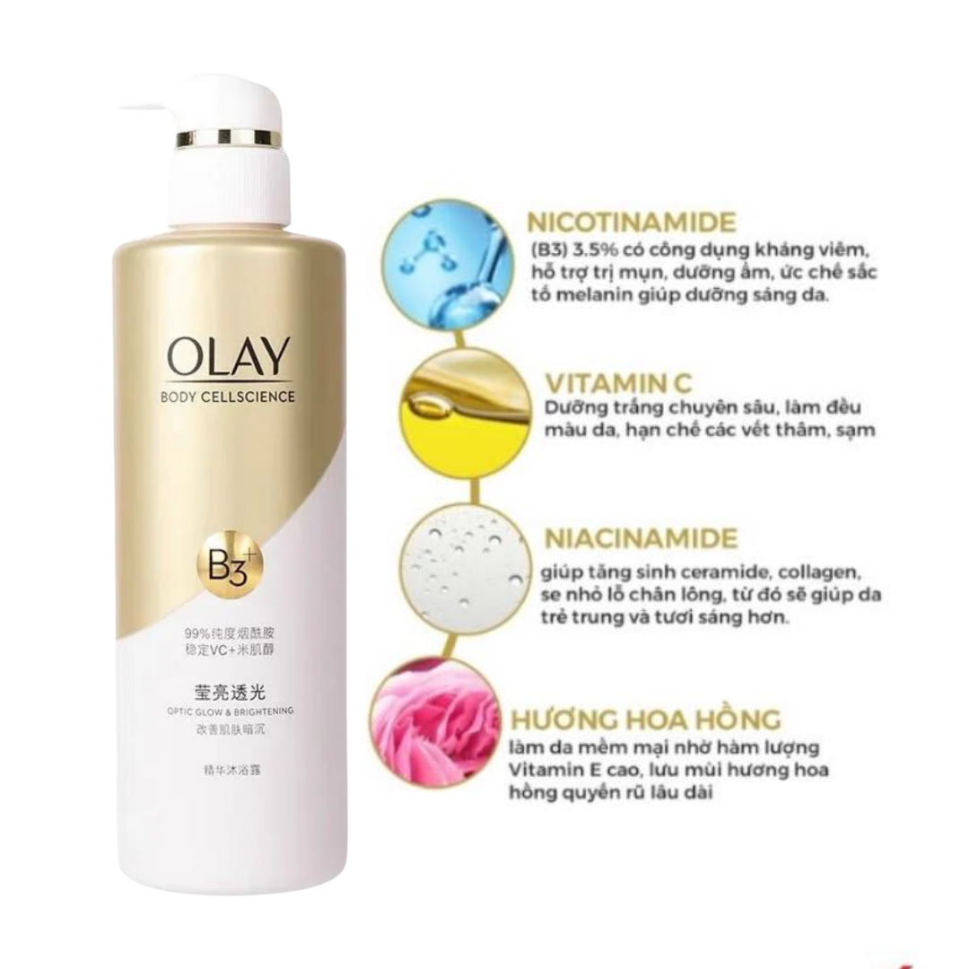 - Olay Body Cellscience B3 Body Wash chứa phức hợp B3 Complex, Nicotinamide (B3) 3.5% và Peptipe: giúp làm sáng, đều màu da, giúp ngăn ngừa các dấu hiệu lão hóa cho làn da, bảo vệ da khỏi tác động tiêu cực của môi trường.