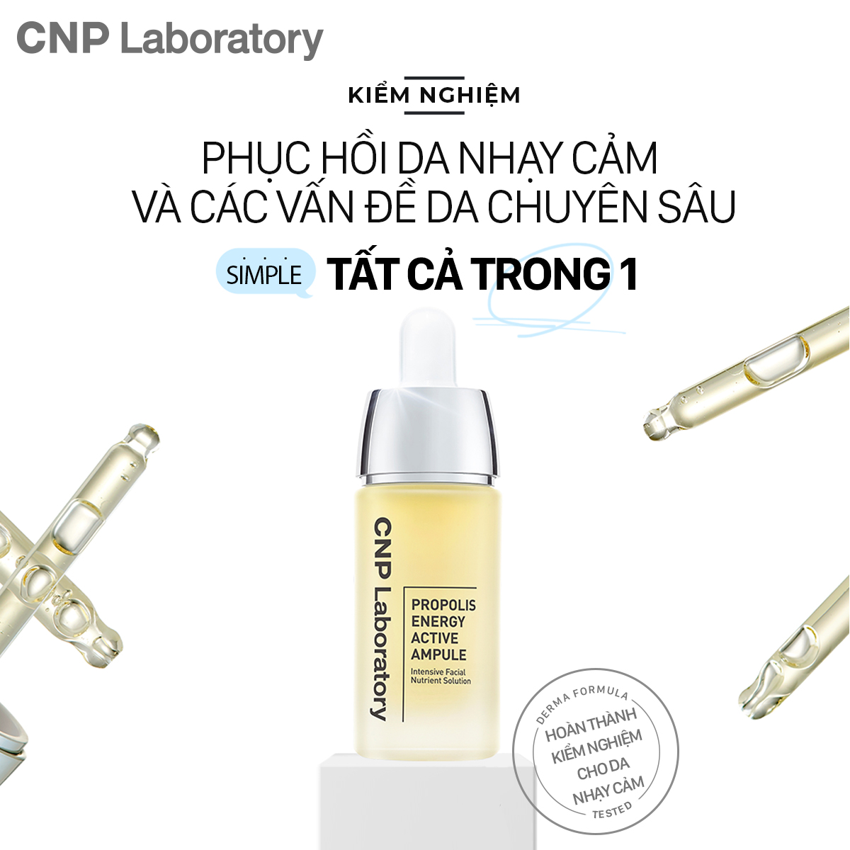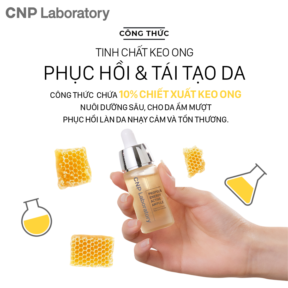 - CNP Laboratory Propolis Energy Active Ampule với thành phần chứa đến 10% Keo ong tinh khiết đậm đặc có khả năng phục hồi cực kỳ nhanh và hiệu quả. Đồng thời hỗ trợ điều trị viêm da, kích ứng, chống oxy hóa và nuôi dưỡng làn da đang gặp tình trạng xỉn màu, thiếu sức sống.
