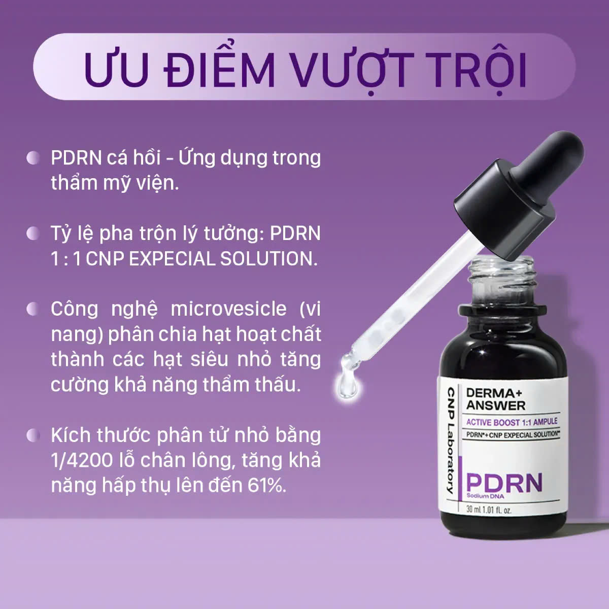 - Với công nghệ phân tử S-PDRN được nén lại thành dạng hạt với kích thước nhỏ bằng 1/4200 lỗi chân lông -> tăng khả năng hấp thụ của tinh chất vào da. PDRN cũng hỗ trợ tái tạo tế bào da, hỗ trợ phục hồi tế bào da bị thương tổn giúp tăng cường mật độ da, giúp da săn chắc, khỏe mạnh