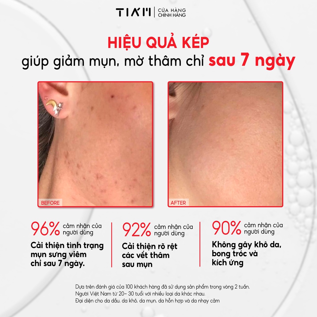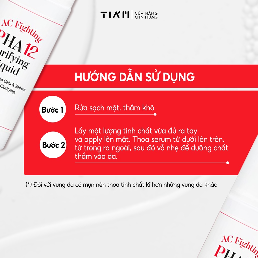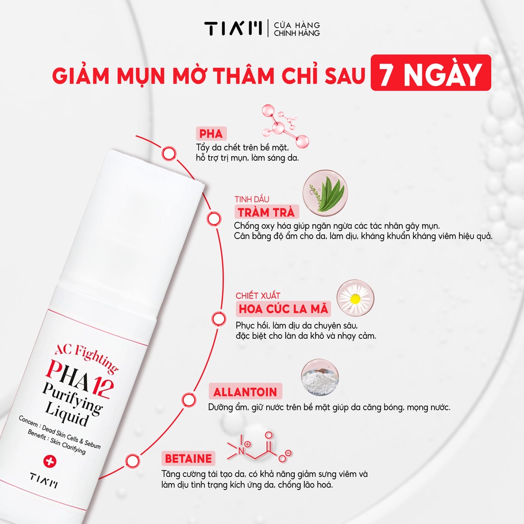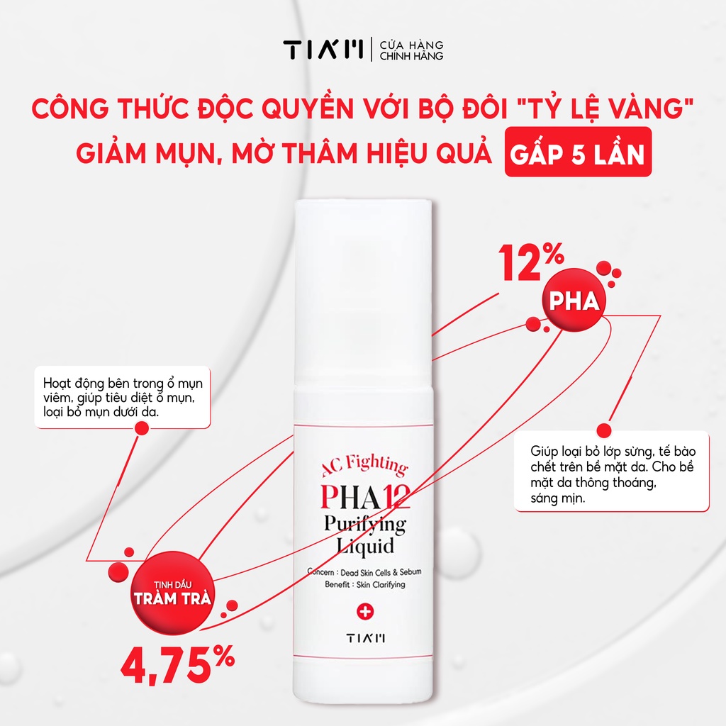 Tinh Chất Ngừa Mụn, Sáng Da, Mờ Thâm Tiam AC Fighting PHA 12 Purifying Liquid là tinh chất dưỡng thuộc thương hiệu Tiam đến từ Hàn Quốc với công thức chứa bộ đôi tỷ lệ vàng độc quyền 12% PHA + 4,75% tinh dầu tràm trà. Giải quyết hiệu quả các vấn đề về mụn như mụn trứng cá, mụn đầu đen, mụn ẩn, mụn cám, sưng viêm, giúp giảm mụn và mờ thâm rõ rệt chỉ sau 7 ngày.