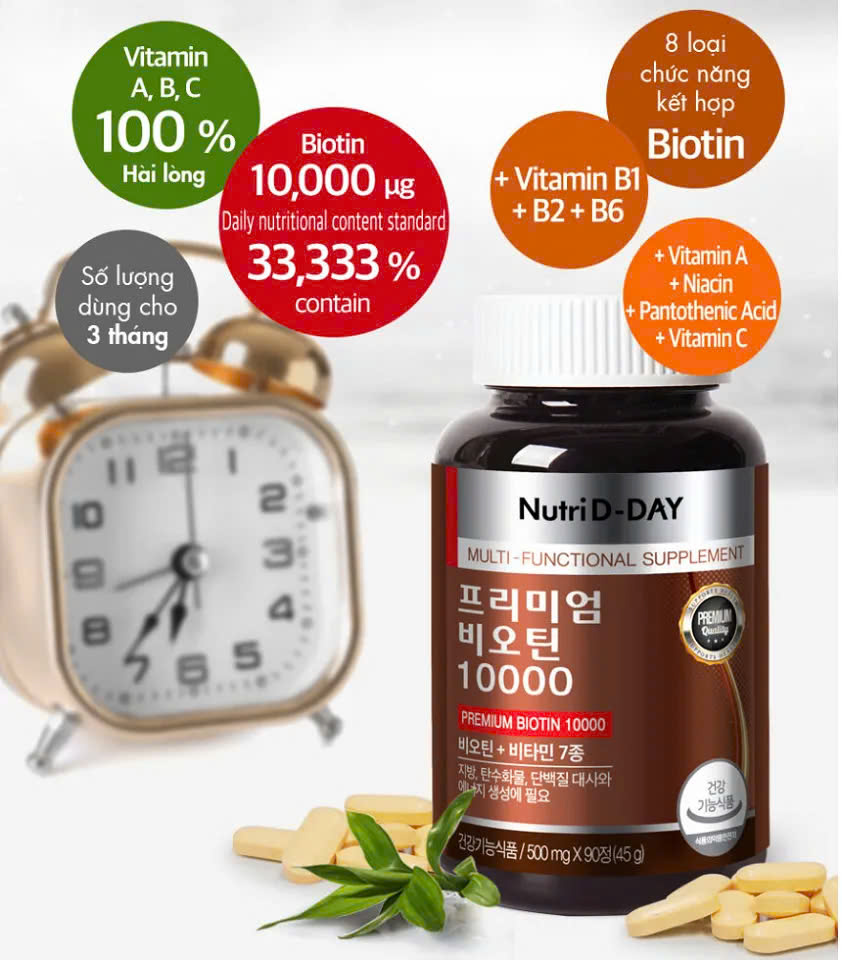 Viên Uống Biotin 10000 Premium Nutri D-Day 90 viên là sản phẩm thực phẩm bảo vệ sức khỏe đến từ thương hiệu Nutri D-Day của Hàn Quốc. Hỗ trợ nang tóc phát triển, hỗ trợ ngăn tình trạng tóc gãy, rụng, giúp nuôi dưỡng tóc đồng thời cải thiện móng chắc khỏe.