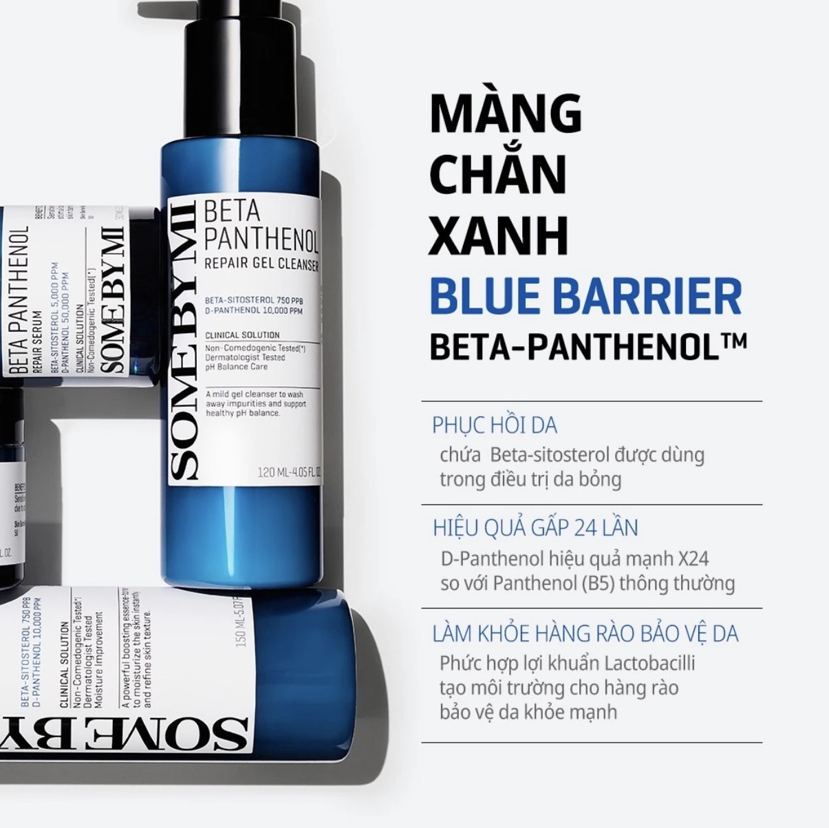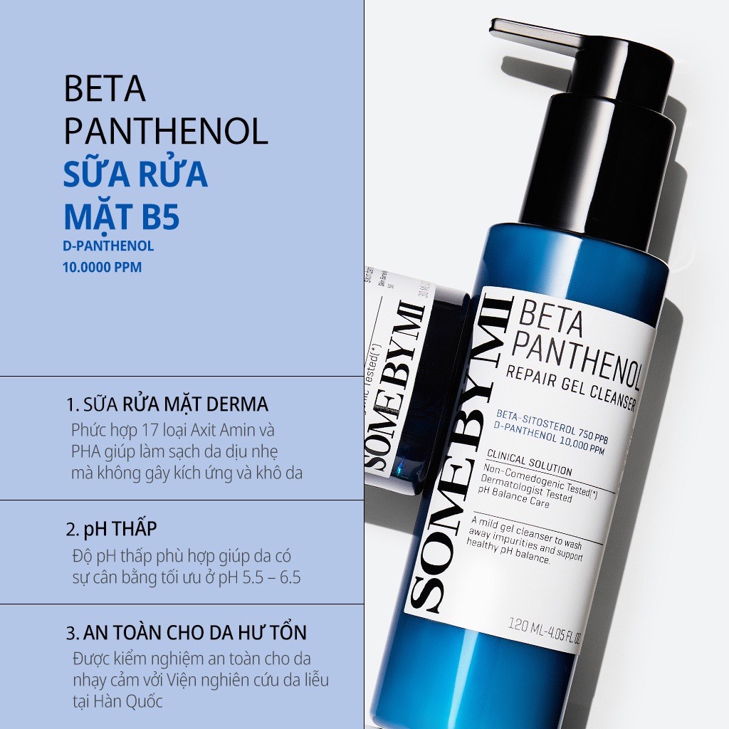 Sữa Rửa Mặt PH Thấp Phục Hồi Da B5 Some By Mi Beta-Panthenol Repair Gel Cleanser 120ml là một sản phẩm sữa rửa mặt đến từ thương hiệu Some By Mi của Hàn Quốc, với công thức chứa Beta-Panthenol™ đã được cấp bằng sáng chế của Some By Mi sẽ giúp loại bỏ bụi bẩn và tạp chất một cách hiệu quả đồng thời mang lại làn da dịu nhẹ và ngậm nước, đồng thời cân bằng độ pH và giúp tăng cường khả năng phục hồi của da.