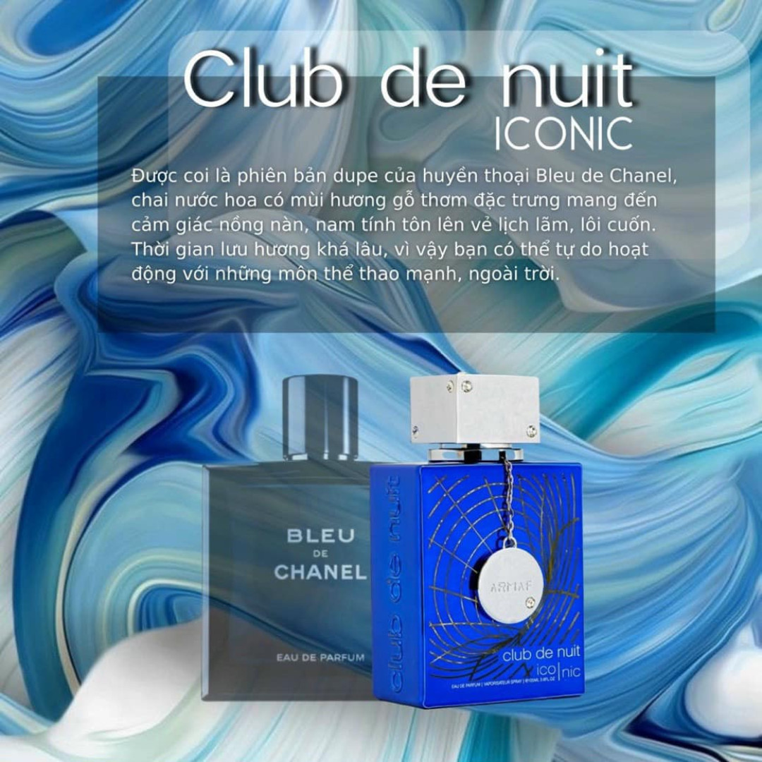 Armaf Club De Nuit Blue Iconic là chai nước hoa được đánh giá có hương thơm giống với người đàn anh Chanel Bleu Eau De Parfum lên đến trên 80%. Nếu bạn lỡ trót mê mẫn mùi hương Blue De Chanel và muốn tìm kiếm một hương thơm tương tự nhưng không phải "đau ví" thì đây sẽ là một sự lựa chọn phù hợp.