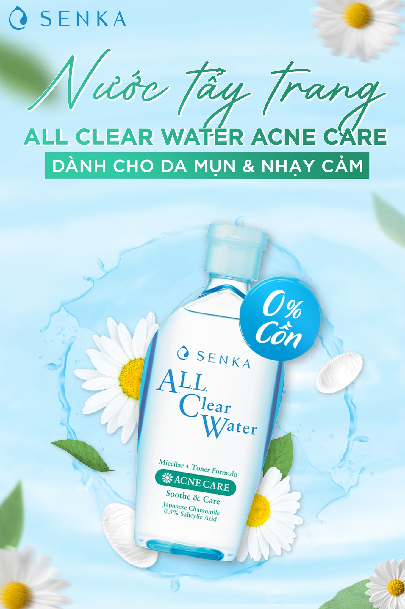 - Nước Tẩy Trang Ngừa Mụn Senka All Clear Water Acne Care 230ml sử dụng công nghệ Micellar được ứng dụng công nghệ Micellar với các phân tử làm sạch siêu nhỏ có khả năng loại bỏ 99% cặn trang điểm, bụi bẩn và dầu thừa trên da, được ứng dụng công nghệ độc quyền Aqua Moist Ex kết hợp từ 2X HA và Tơ Tằm Trắng giúp giảm ma sát trên da và làm giảm tình trạng sưng viêm của các nốt mụn, giúp giảm thiểu khả năng gây kích ứng da khi sử dụng nước tẩy trang: