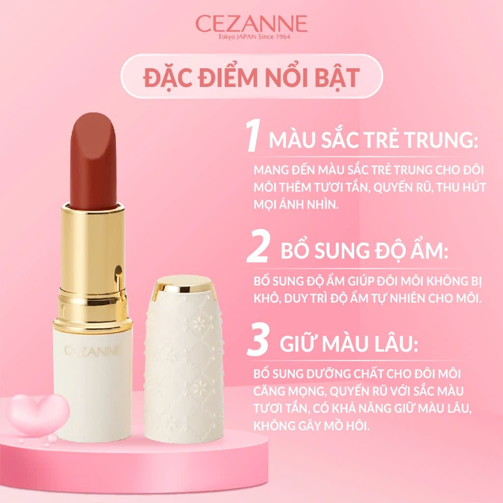 Son Thỏi Lì Sáp Cezanne Mềm Mịn Lâu Trôi 3.9g đến từ thương hiệu Cezanne - Nhật Bản. Son môi giúp giữ lại độ ẩm, bảo vệ đôi môi của bạn khỏi bị khô và thô ráp, không chỉ giúp đôi môi ửng hồng tự nhiên mà còn là "trợ thủ" đắc lực của phái đẹp trong những bữa tiệc, đi hẹn hò, dạo phố.