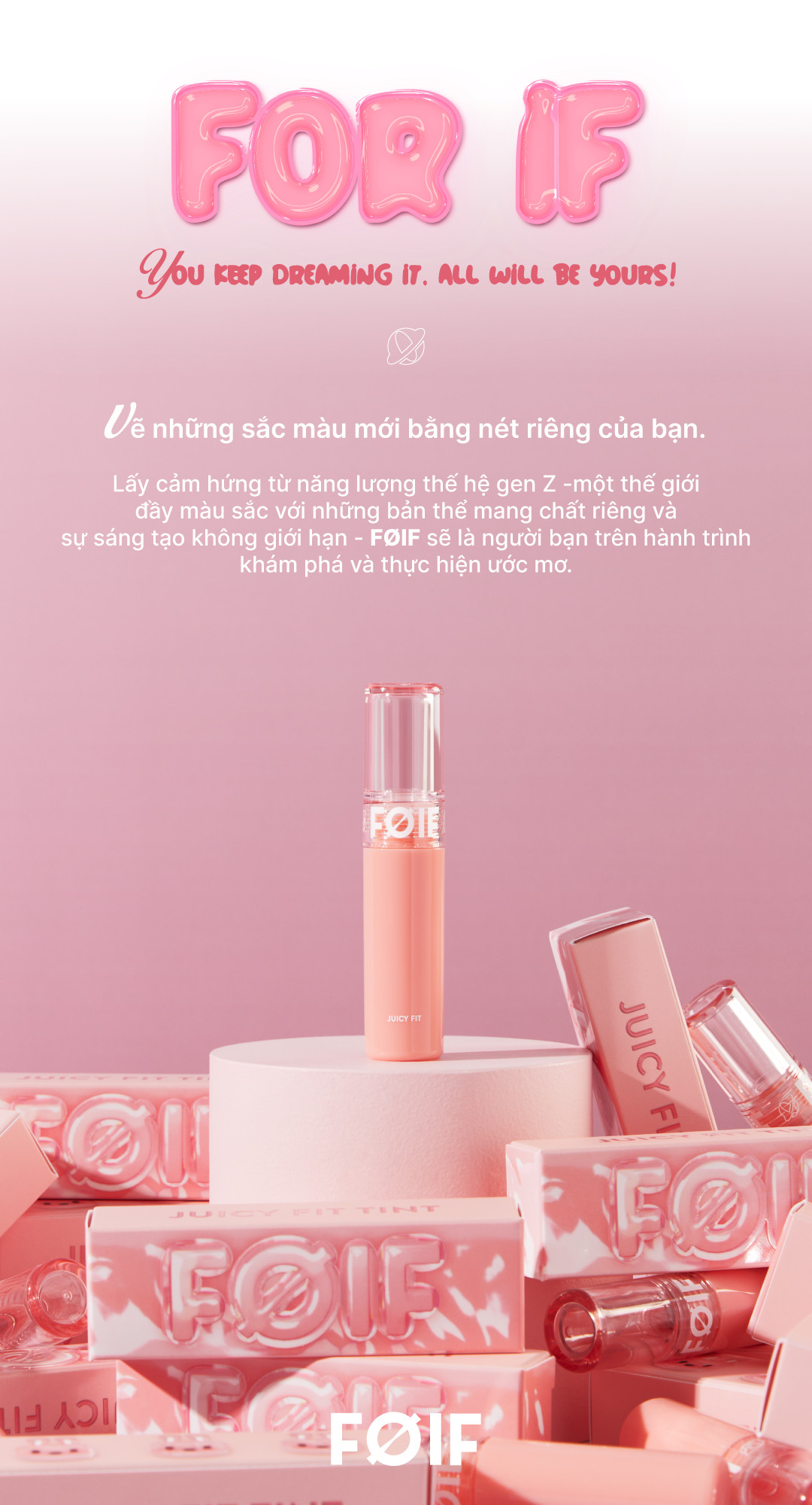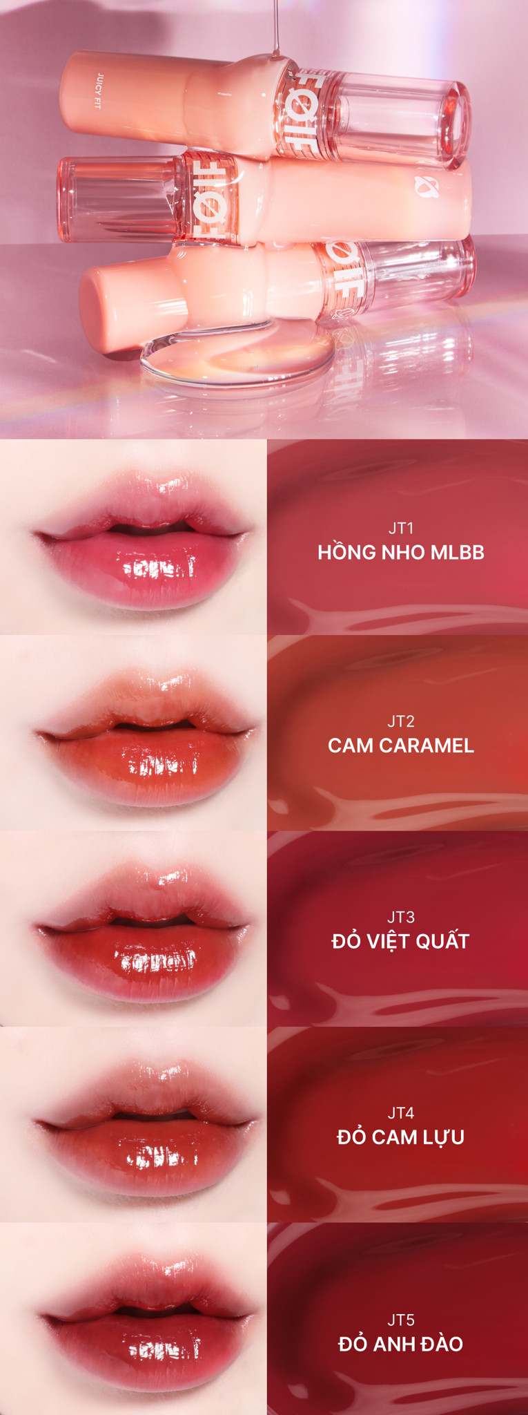 - Son Tint Bóng Thuần Chay, Ẩm Mọng, Bền Màu FOIF Juicy Fit Tint có thiết kế hình trụ thon dài với tông màu hồng baby pastel chủ đạo, mang lại sự nghịch ngợm pha chút bánh bèo.