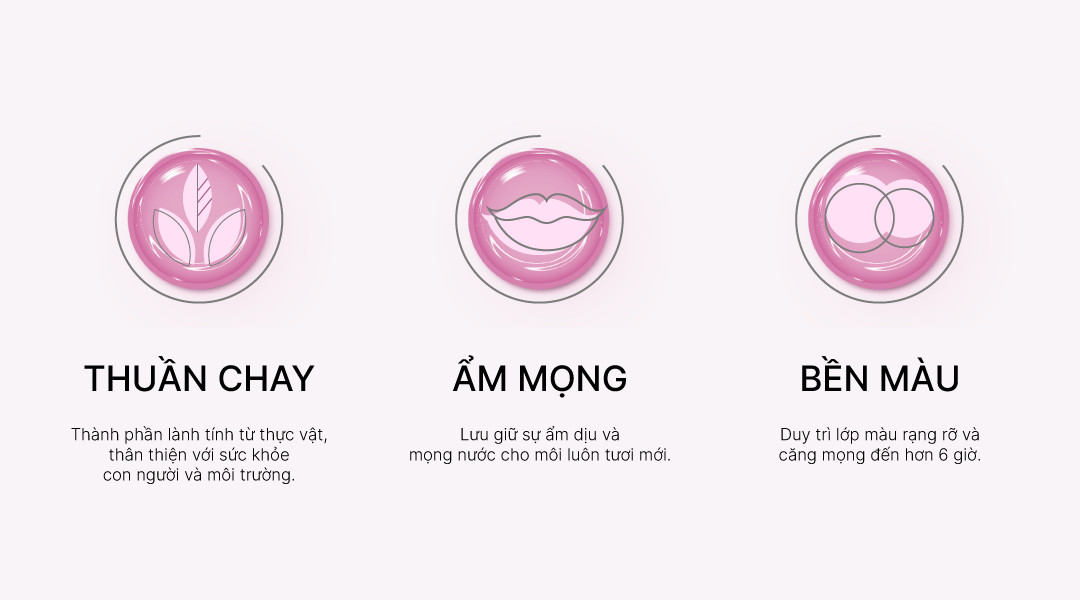- Chất son với công thức tint mỏng nhẹ, nhưng vẫn phủ đầy rãnh môi, dễ dàng điều chỉnh màu cũng như lượng son thích hợp khi sử dụng mà không làm khô môi, lem, hay nặng môi.