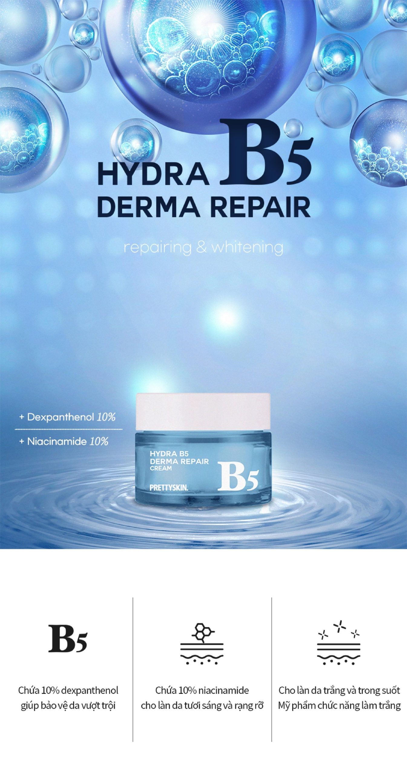 - Kem Dưỡng Phục Hồi, Trắng Sáng Da PrettySkin Hydra B5 Derma Repair Cream là bước cuối cùng cực kỳ cần thiết trong quy trình dưỡng da hàng ngày của bạn, giúp phục hồi những hư tổn, tổn thương trên da đồng thời nuôi dưỡng làn da trắng sáng từ sâu trong từng tế bào, với khả năng bảo vệ da vững chắc khỏi ánh nắng mặt trời.