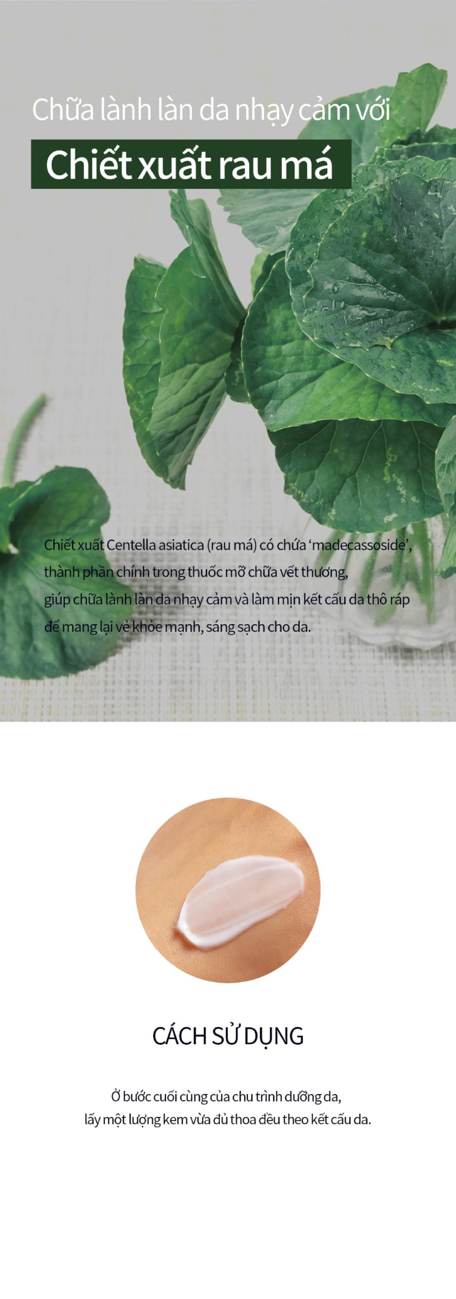 + Centella Asiatica (RAU MÁ): Thảo dược tự nhiên, được sử dụng trong y học truyền thống để điều trị các vấn đề về da như sẹo, mụn và viêm da. Kháng viêm và khả năng kích thích tái tạo tế bào da mới, giúp cải thiện tình trạng da bị tổn thương và giảm sự xuất hiện của vết sẹo. Centella Asiatica còn có tác dụng làm dịu, giúp giảm sự kích ứng và làm mát da, giúp cho làn da trở nên khỏe mạnh hơn.