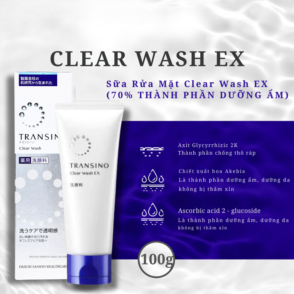 Sữa rửa mặt Transino Clear Wash EX là sản phẩm chăm sóc da mặt đến từ Nhật Bản. Sản phẩm được sản xuất trên dây chuyền công nghệ hiện đại, với các thành phần lành tính, an toàn cho da. Sữa rửa mặt với lớp bọt dày giúp cuốn trôi bụi bẩn và bã nhờn làm se khít lỗ chân lông.