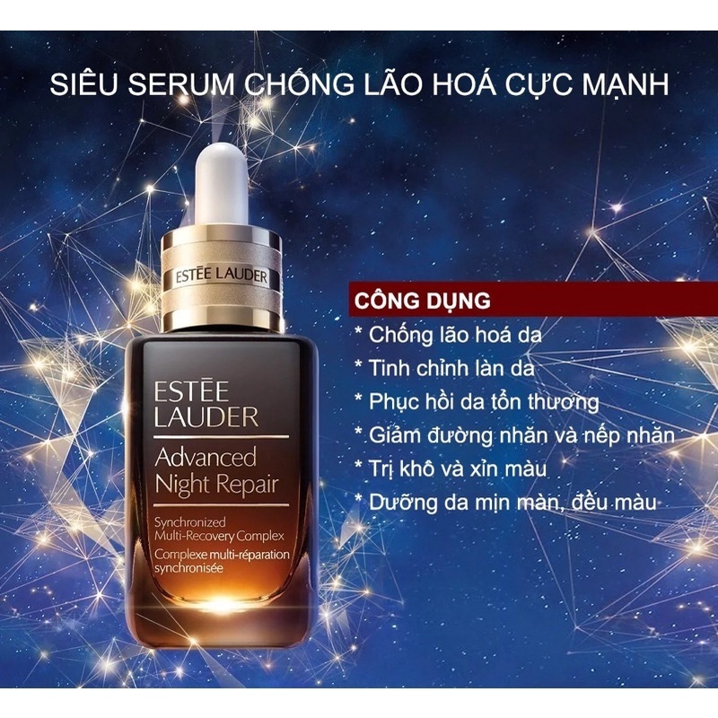 Tinh Chất Dưỡng Da Ban Đêm, Cấp Ẩm, Phục Hồi Estee Lauder 7ml là biểu tượng sáng giá được ưa chuộng và bán chạy nhất của Estee Lauder được ra đời năm 1982. Sản phẩm này được nằm trong bảng xếp hạng uy tín nhất trong hạng mục serum chống lão hóa và nhận được hơn 70 giải thưởng toàn cầu. Tinh Chất Phục Hồi Da Ban Đêm 30ml là loại serum đầu tiên sử dụng Hyaluronic Acid tham gia vào bước dưỡng ẩm da. Ngoài ra, sản phẩm còn sử dụng công nghệ độc quyền ChronoluxCB - công nghệ giúp kích hoạt các gen có khả năng đồng bộ hóa các chức năng tế bào trong chu kỳ 24 giờ, nhờ đó thúc đẩy quá trình tái tạo da ngay trong khi ngủ, mang đến làn da rạng rỡ, khỏe mạnh hơn khi thức dậy mỗi ngày.