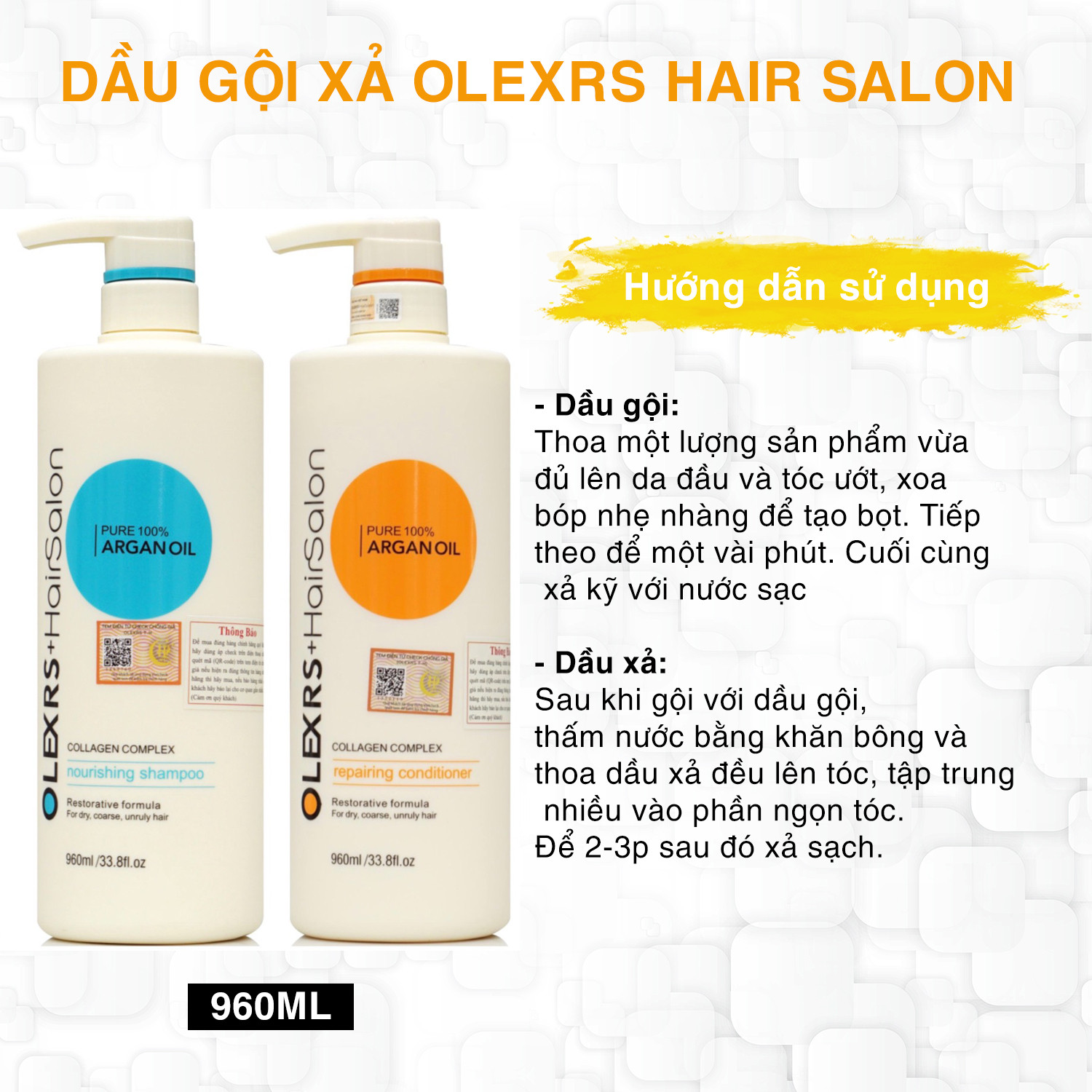 Dầu Gội Xả Olexrs Argan Oil Hair Salon là sản phẩm chăm sóc tóc chuyên nghiệp có chứa tinh dầu argan hỗ trợ dưỡng tóc và giúp hỗ trợ phát triển nang tóc vô cùng hiệu quả. Sản phẩm đang được sử dụng rộng rãi và ưa chuộng tại thị trường Anh Quốc và nhiều thị trường lớn trên thế giới, trong đó có Việt Nam.