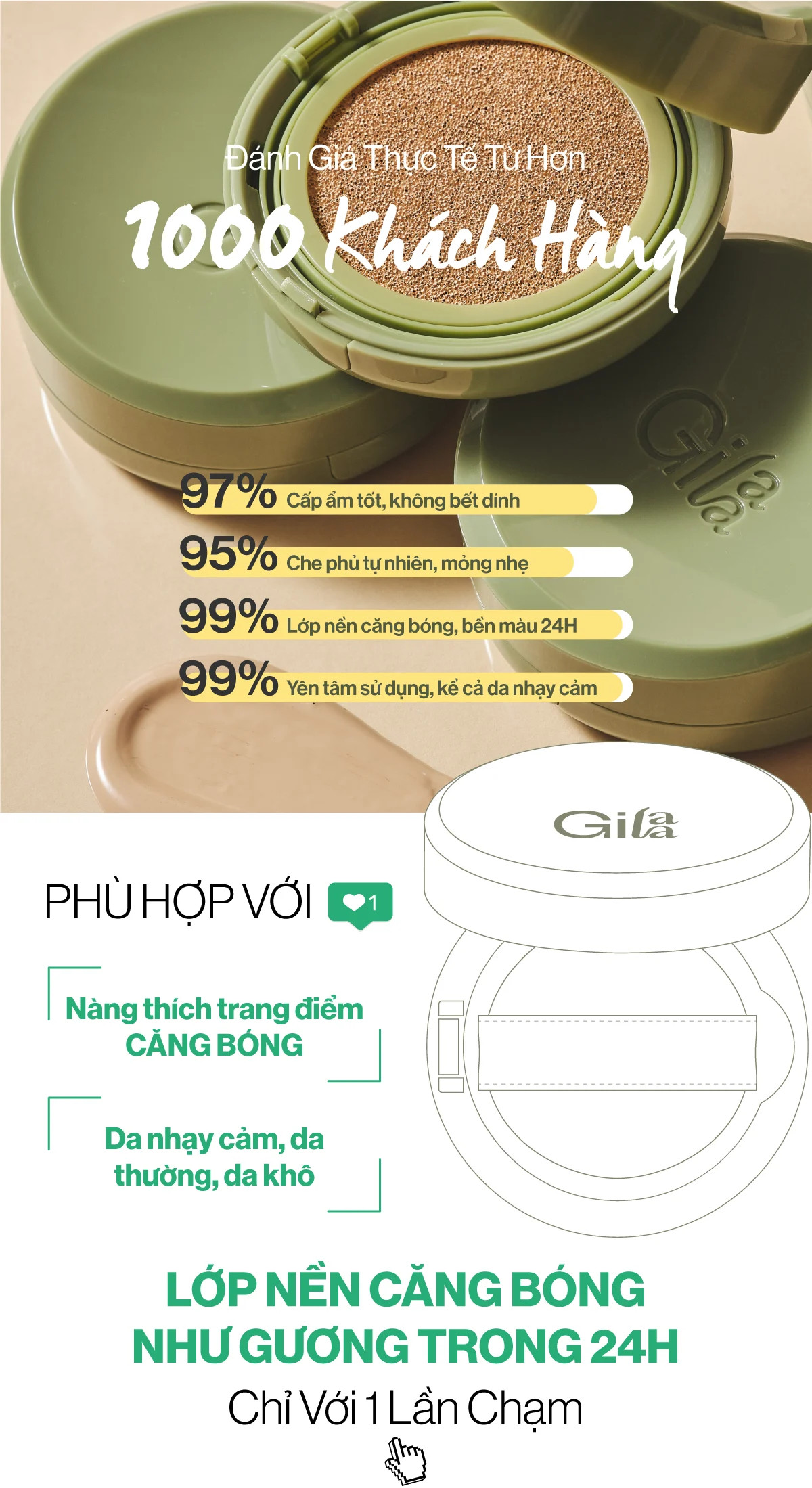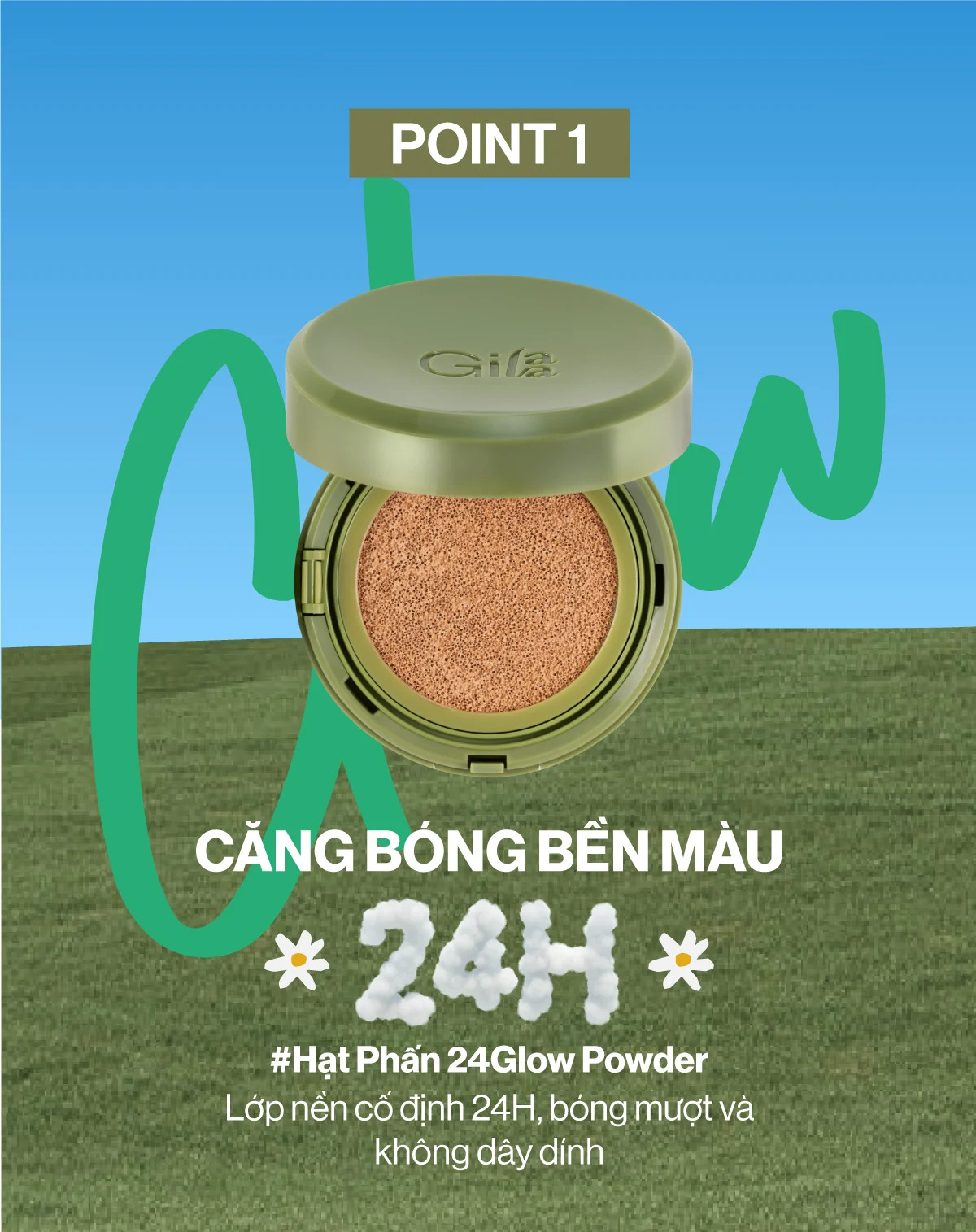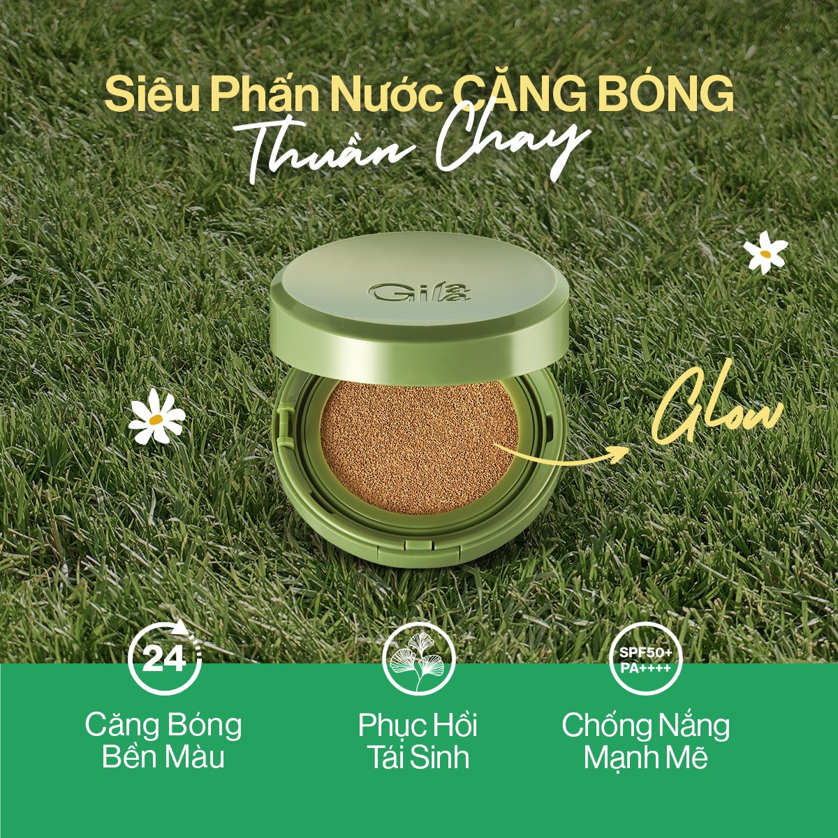 - Phấn Nước Dưỡng Ẩm Căng Bóng Gilaa Vegan Super Glow Cushion cải tiến với hạt phấn làm căng bóng 24Glow Powder, cố định nền 24H kết hợp chăm sóc tái sinh làn da với 20% Rau Má GCE+ và chống nắng SPF50+/PA++++.