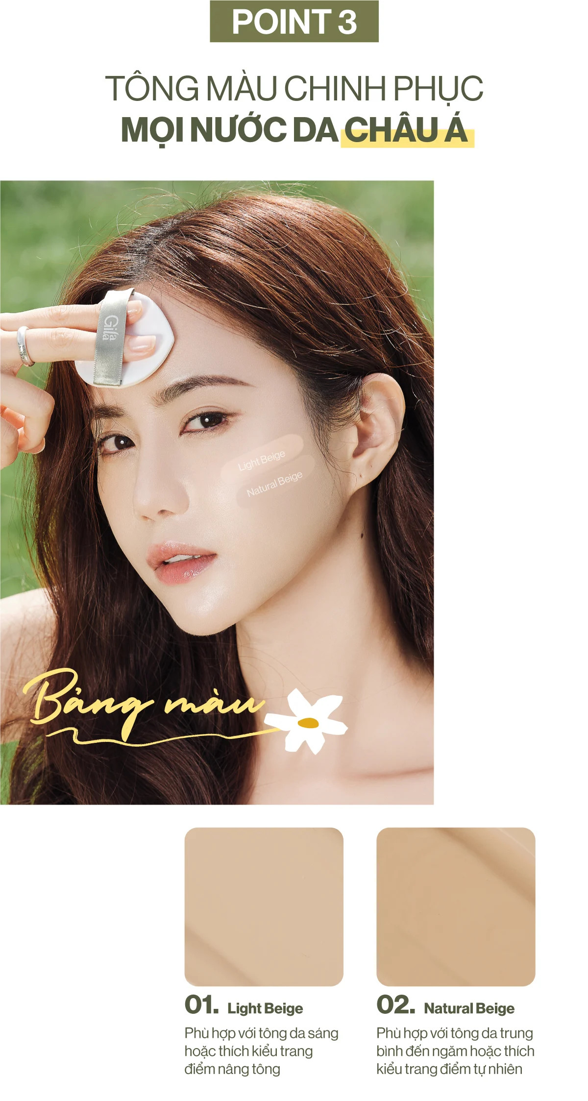 • 02 Natural Beige: Phù hợp với tông da trung bình đến ngăm hoặc thích kiểu trang điểm tự nhiên.
