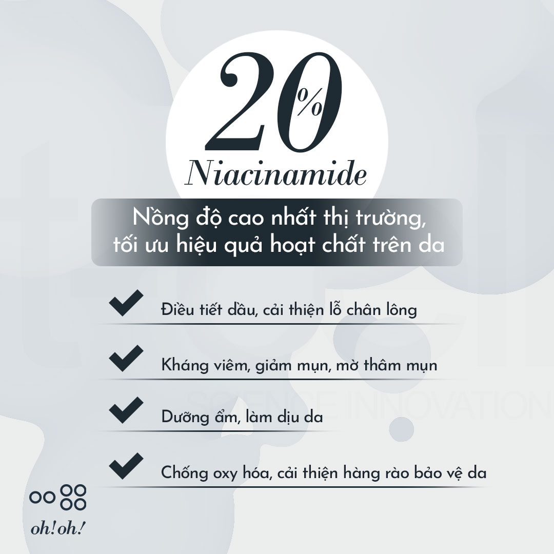 - Sản phẩm chứa nồng độ hoạt chất chính 20% Niacinamide giúp hỗ trợ làm giảm mụn, kiểm soát dầu thừa, cải thiện lỗ chân lông, dưỡng sáng da.