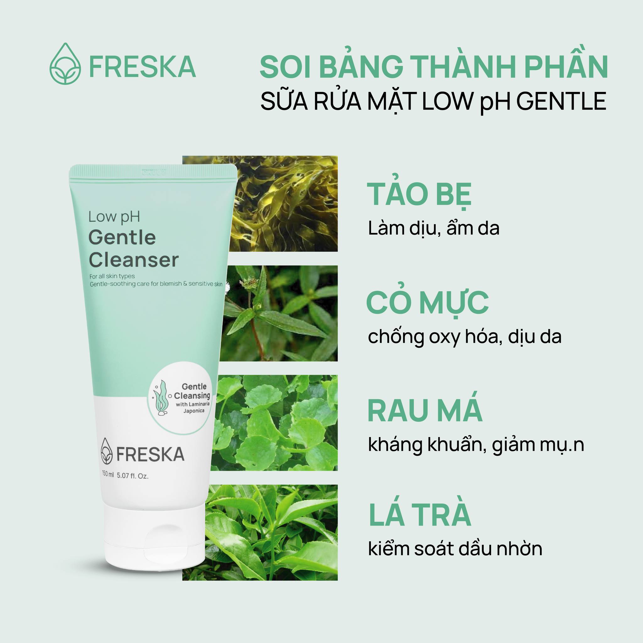 - Sữa Rửa Mặt Sạch Sâu Dịu Nhẹ Freska Low PH Gentle Cleanser chứa thành phần tự nhiên đặc biệt là tảo bẹ, giúp làm sạch da an toàn, mịn màng và khỏe mạnh. Có độ pH thấp chứa axit amin họat động bề mặt giúp loại bỏ bã nhờn dư thừa và các tạp chất khác trên da. Bọt dày, nhẹ nhàng làm sạch, mang lại làn da cảm giác sạch sẽ và cân bằng độ ẩm.
