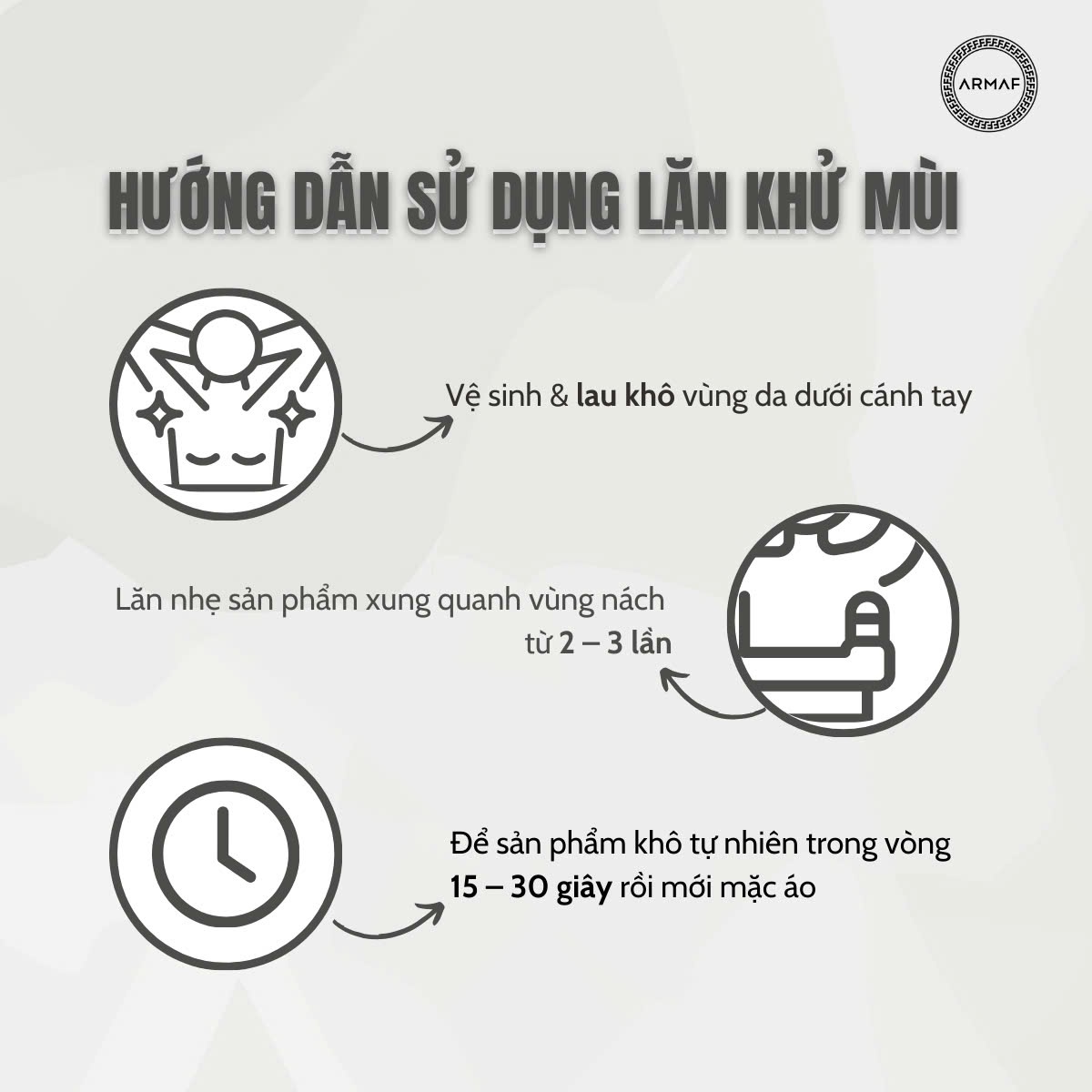 ∞ Hướng dẫn sử dụng: Đầu tiên, vệ sinh sạch sẽ và lau khô vùng da dưới cánh tay. Tiếp theo, lăn nhẹ sản phẩm xung quanh vùng nách từ 2 – 3 lần. Để sản phẩm khô tự nhiên trong vòng 15 – 30 giây rồi mới mặc quần áo.